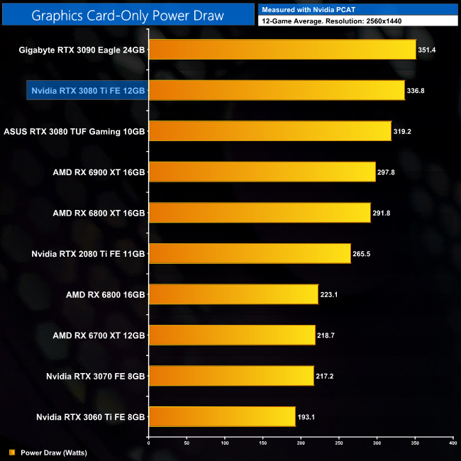 Here we present power draw figures for the graphics card-only, on a per-game basis for all twelve games we tested at 1440p. This is measured using Nvidia's Power Capture Analysis Tool, also known as PCAT. You can read more about our updated power draw testing methodology HERE.