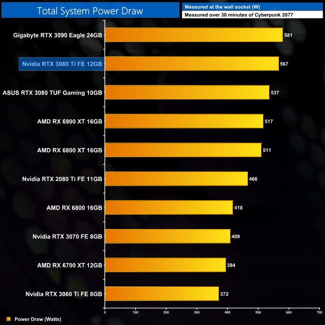 We measure system-wide power draw from the wall while running Cyberpunk 2077 for 30 minutes.