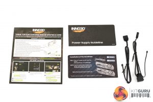 Inside we find the usual array of documentation, but also two RGB cables which can be used to connect the card to your motherboard (or other RGB device) to control the lighting that way.
