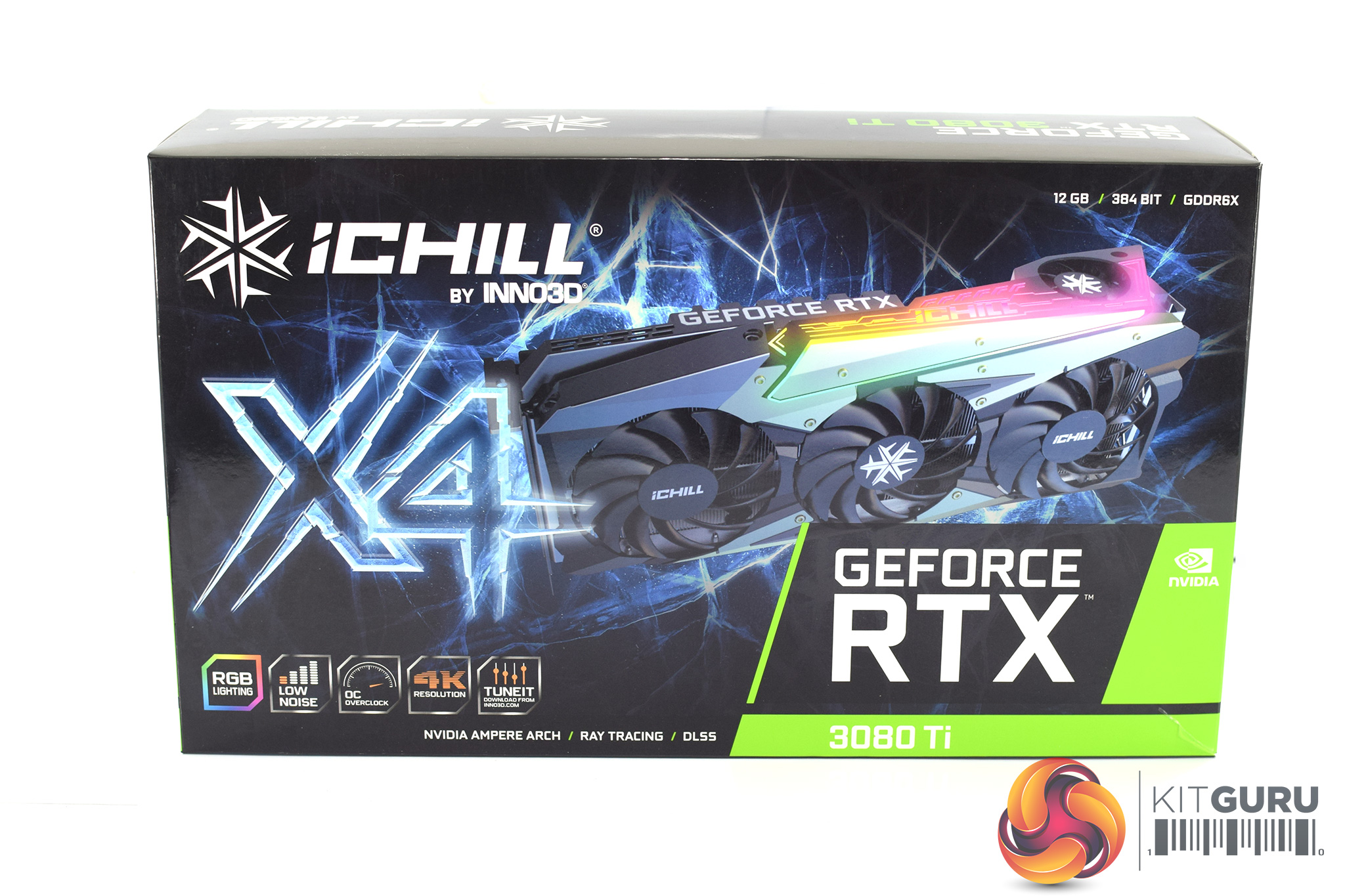 As for the Inno3D RTX 3080 Ti iChill X4, this ships in an eye-catching box, with a large image of the card visible next to the X4 branding.
