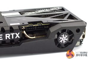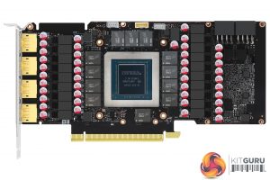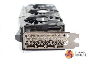 We can also note 2x 8-pin power inputs, while we also get a closer look at the 45mm fan designed to aid VRM cooling. For video outputs, we find 3x DisplayPort 1.4 and 1x HDMI 2.1.