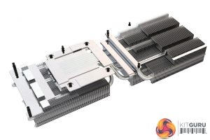 As for the heatsink, this uses a total of eight heatpipes, seven of which make contact with the GPU while the eighth is using for VRM. The memory modules contact with a metal plate section that sits around the central heatpipes.