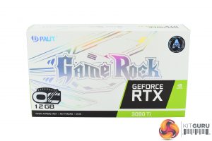 The last card to look at is the Palit RTX 3080 Ti GameRock OC. This ships in a white box, with the GameRock logo taking pride of place on the front.