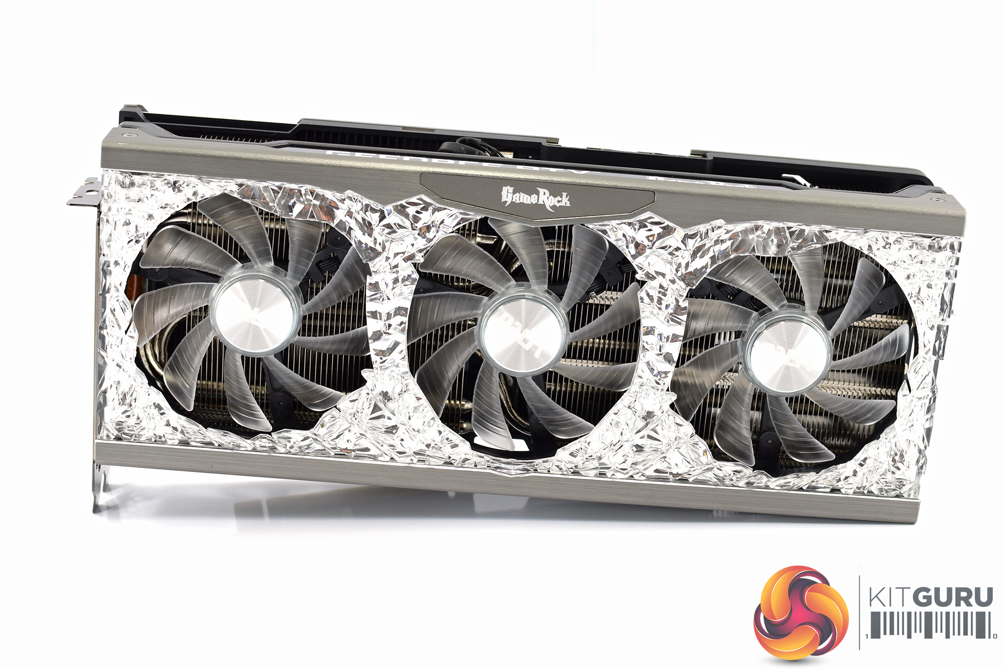 The card itself is identical to the RTX 3090 GameRock OC we reviewed earlier this year, which of course makes a lot of sense. It's another striking design, with lots of crystal-like plastic visible on the shroud. As shown in our video, this acts as a giant diffuser for the RGB lighting, which is certainly an impressive visual touch.