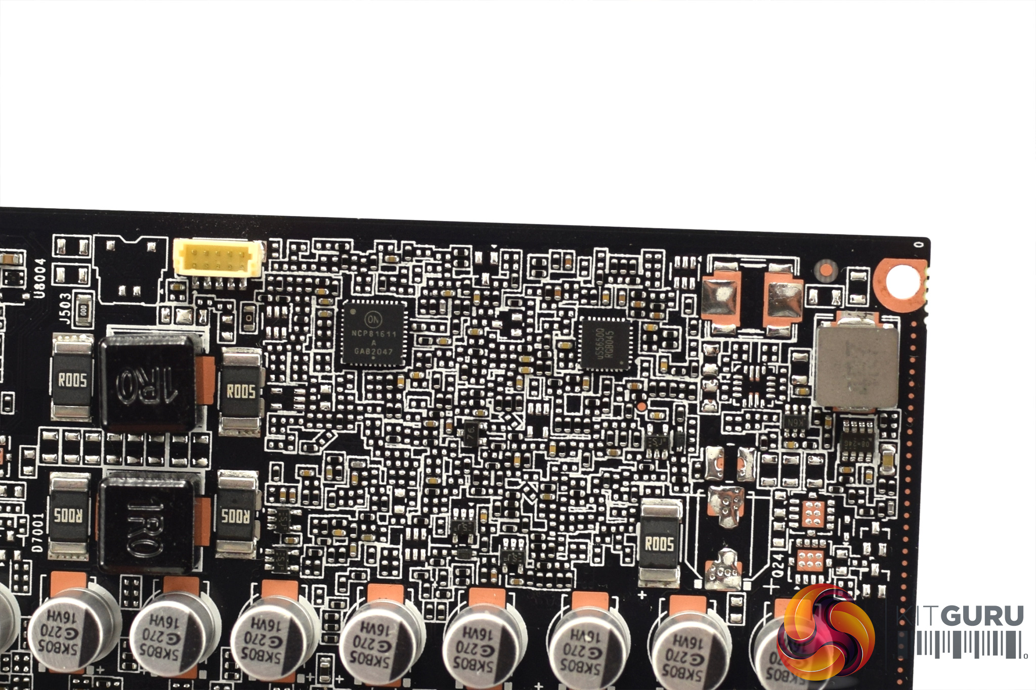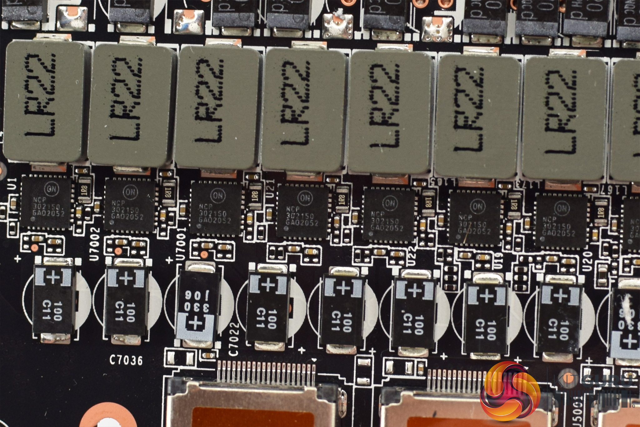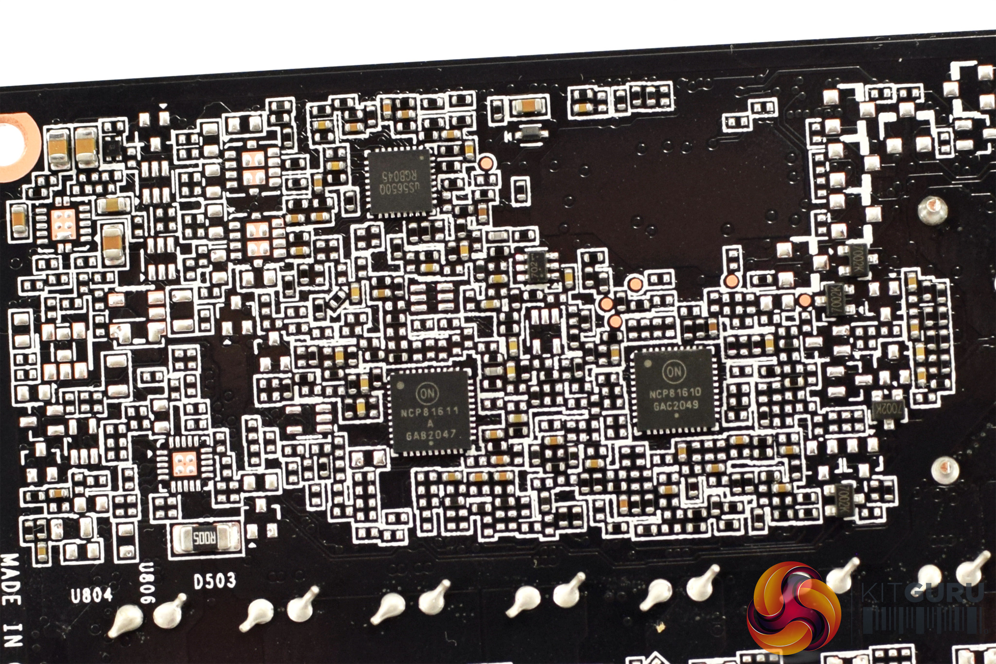 Taking the card apart to look at the PCB, we can see Palit has opted for a ‘beef up' VRM, with a total of 22 phases, which we'd expect to be split with 18 for the GPU and 4 for the memory. OnSemi's NCP302150 MOSFETs are used, rated for 50A average current output, while we can note two OnSemi NCP81611 controllers and one NCP81610 controller, alongside two UPI uS5650Q controllers.