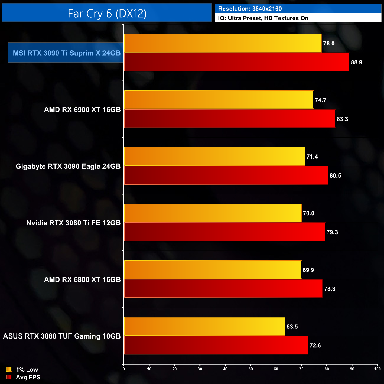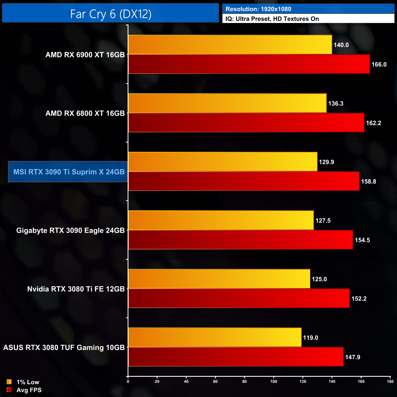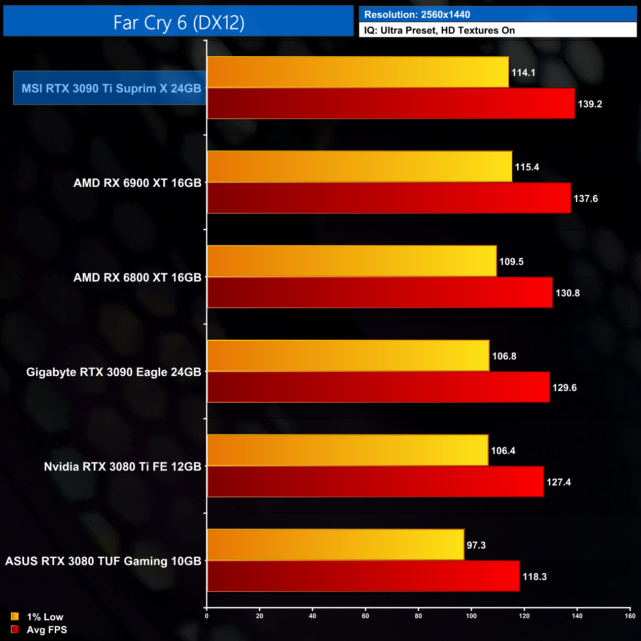 Far Cry 6 is another title where AMD does well, and do note this is actually an AMD sponsored game! Even at 4K, the RTX 3090 Ti is just 7% faster than the RX 6900 XT, and that margin shrinks to just 1% – or basically nothing – at 1440p. Relative to the RTX 3090, we're seeing performance improvements of 7% at 1440p, and then 10% at 4K.