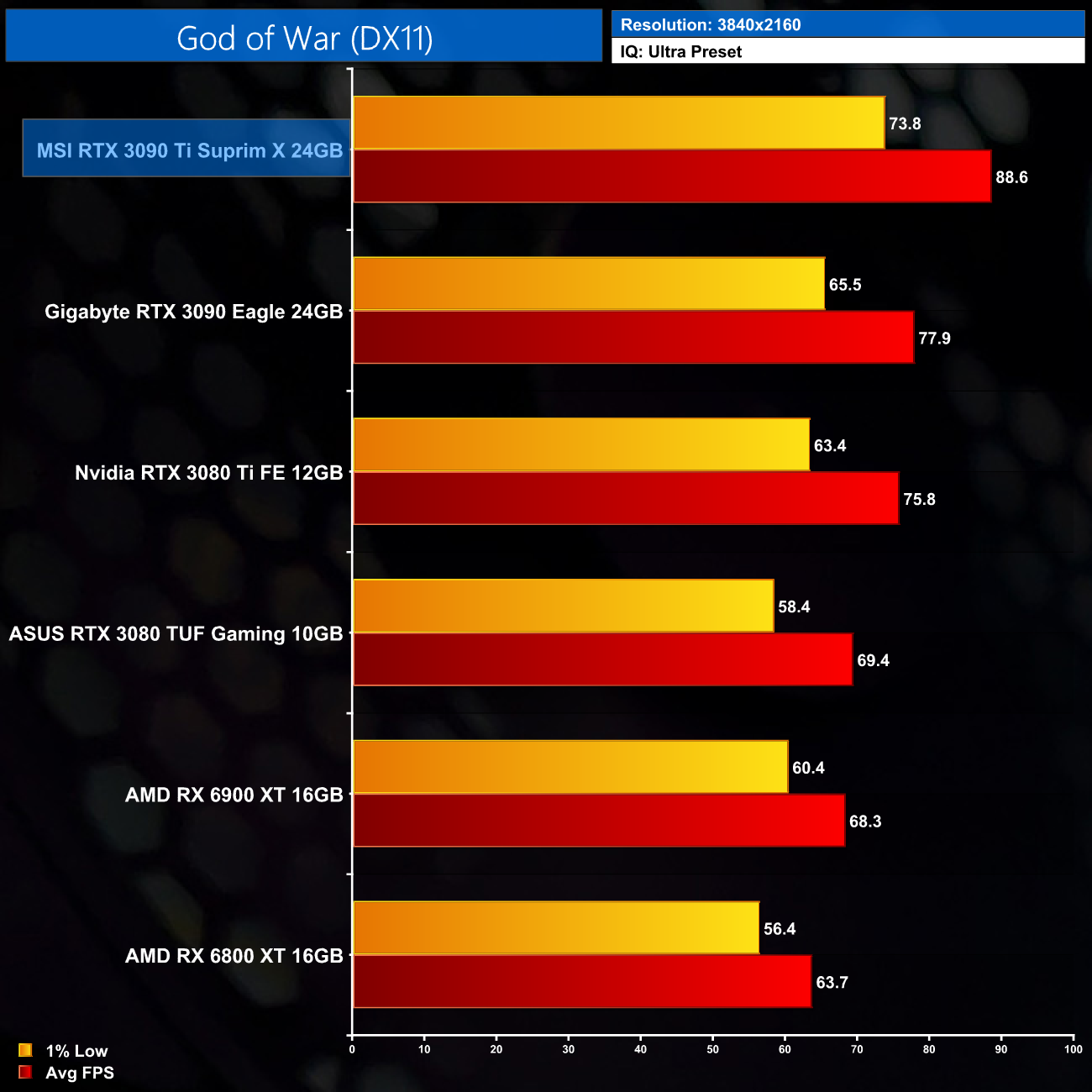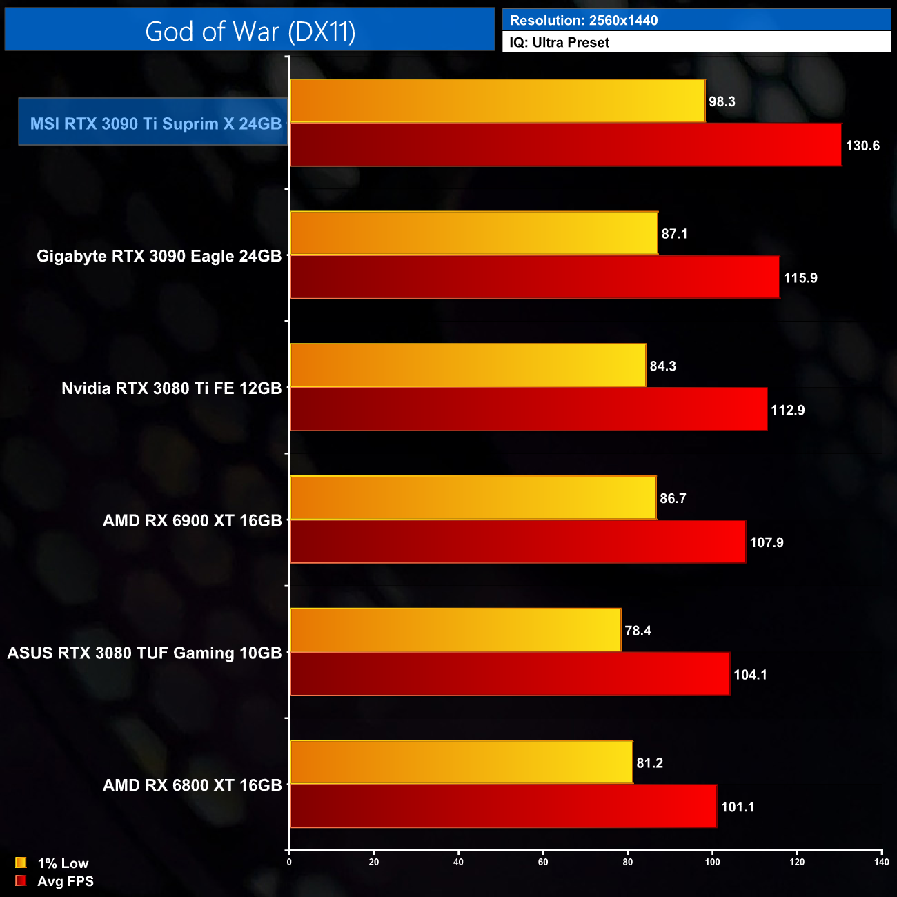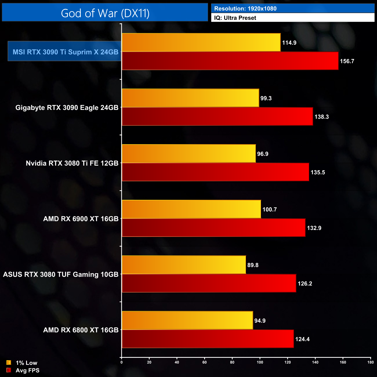God of War is more favourable to Nvidia cards, and we do also see better scaling for the 3090 Ti here – at 1440p it hits 131FPS on average, making it 13% faster than the RTX 3090, and 21% faster than the RX 6900 XT.