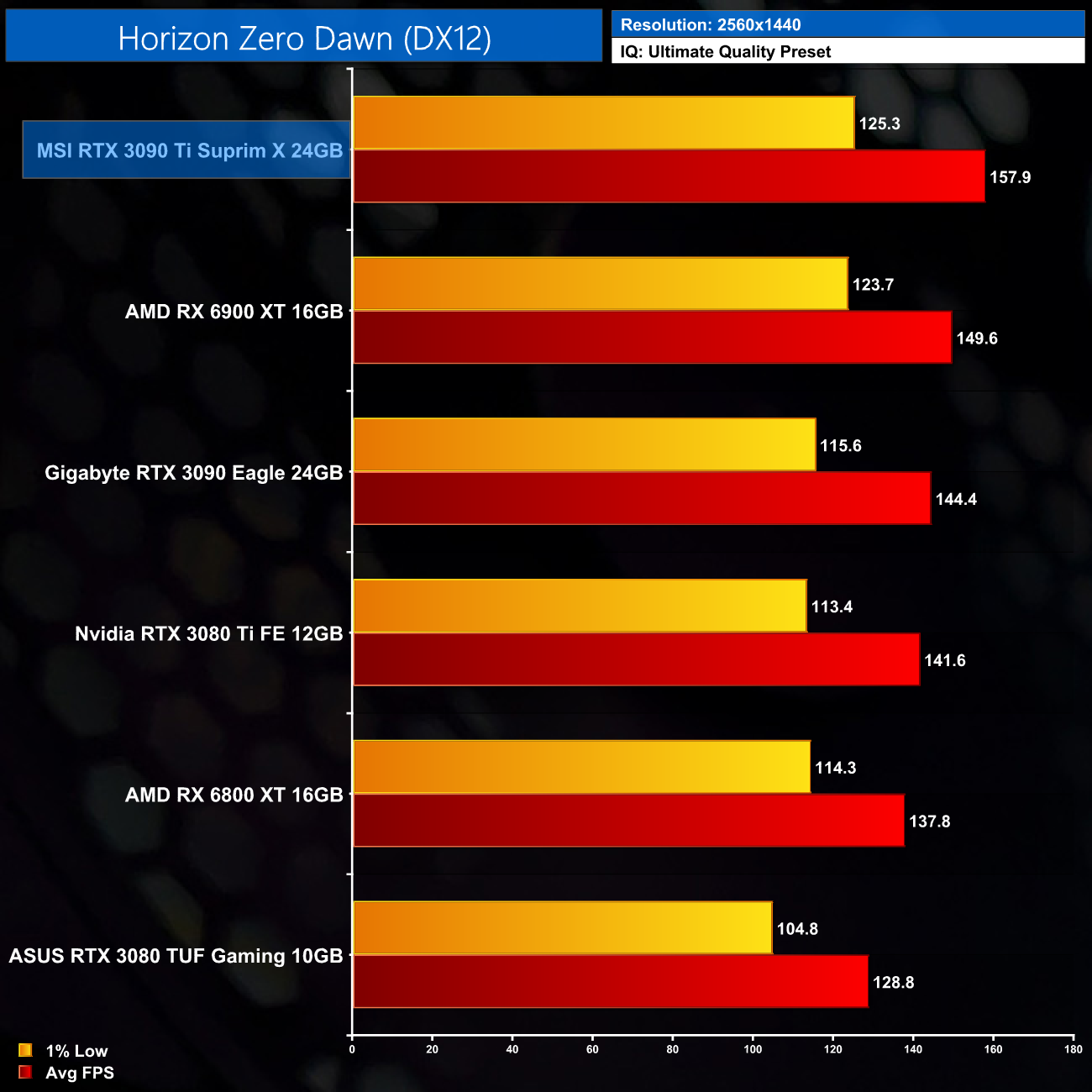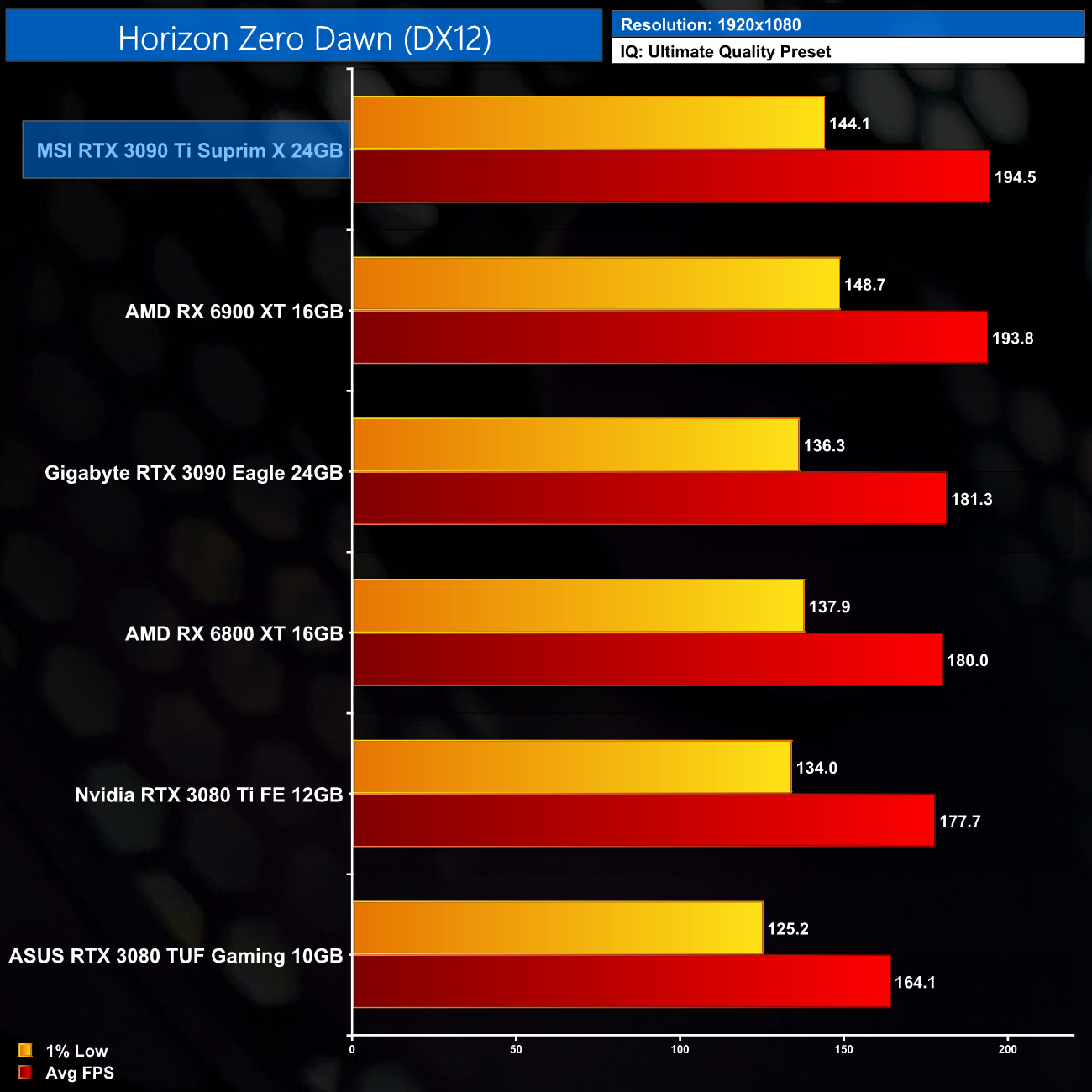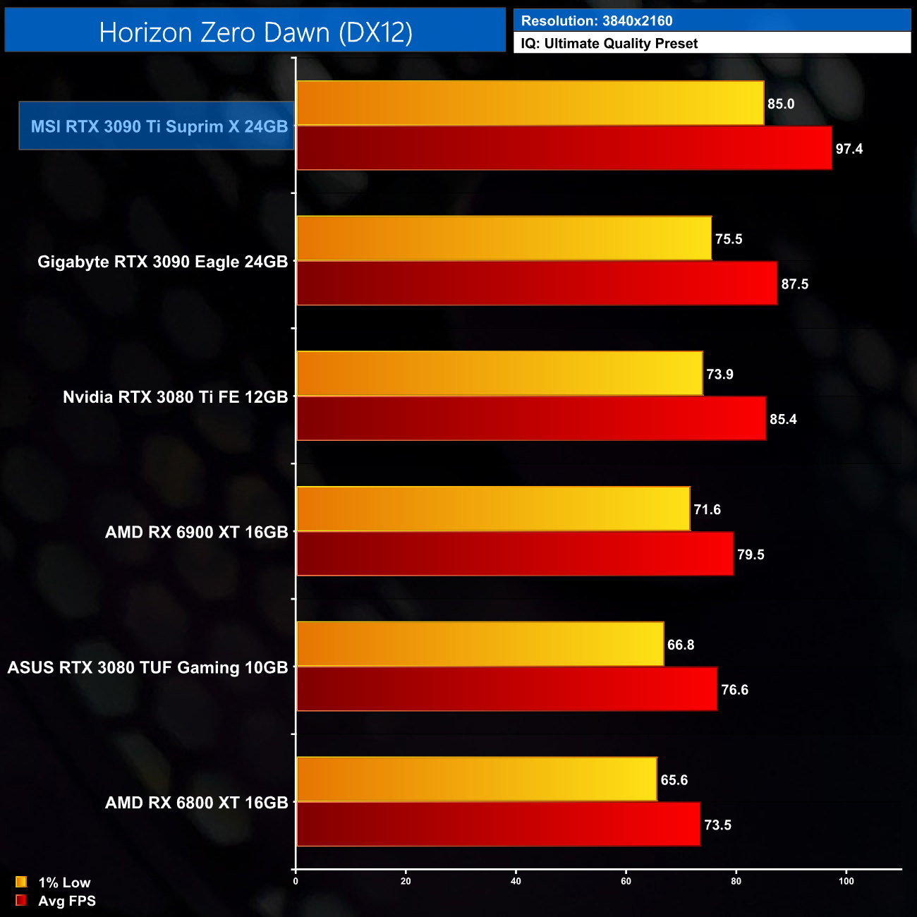 Horizon Zero Dawn is another title where the RX 6900 XT does well to keep up with the RTX 3090 Ti, as Nvidia's new flagship is only 5% faster than its AMD's rival at 1440p. At 4K however we see the best from the 3090 Ti, it's nearly able to hit 100FPS, making it 11% faster than the RTX 3090 and 23% faster than the