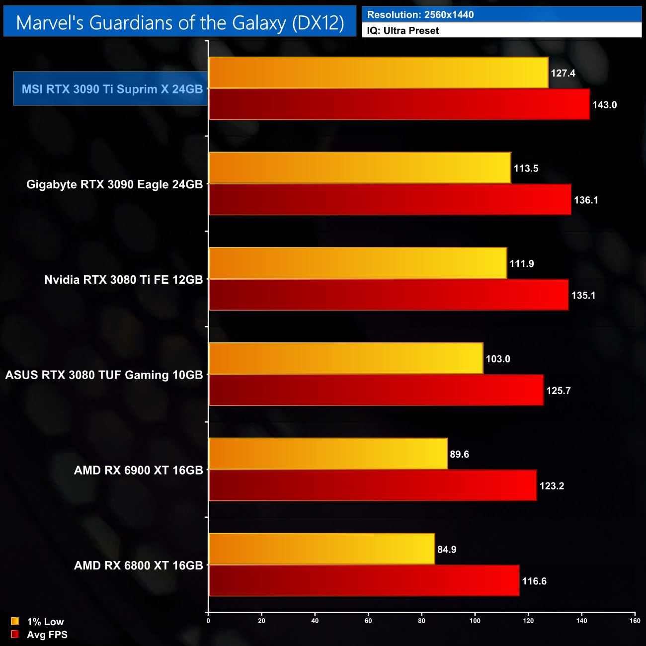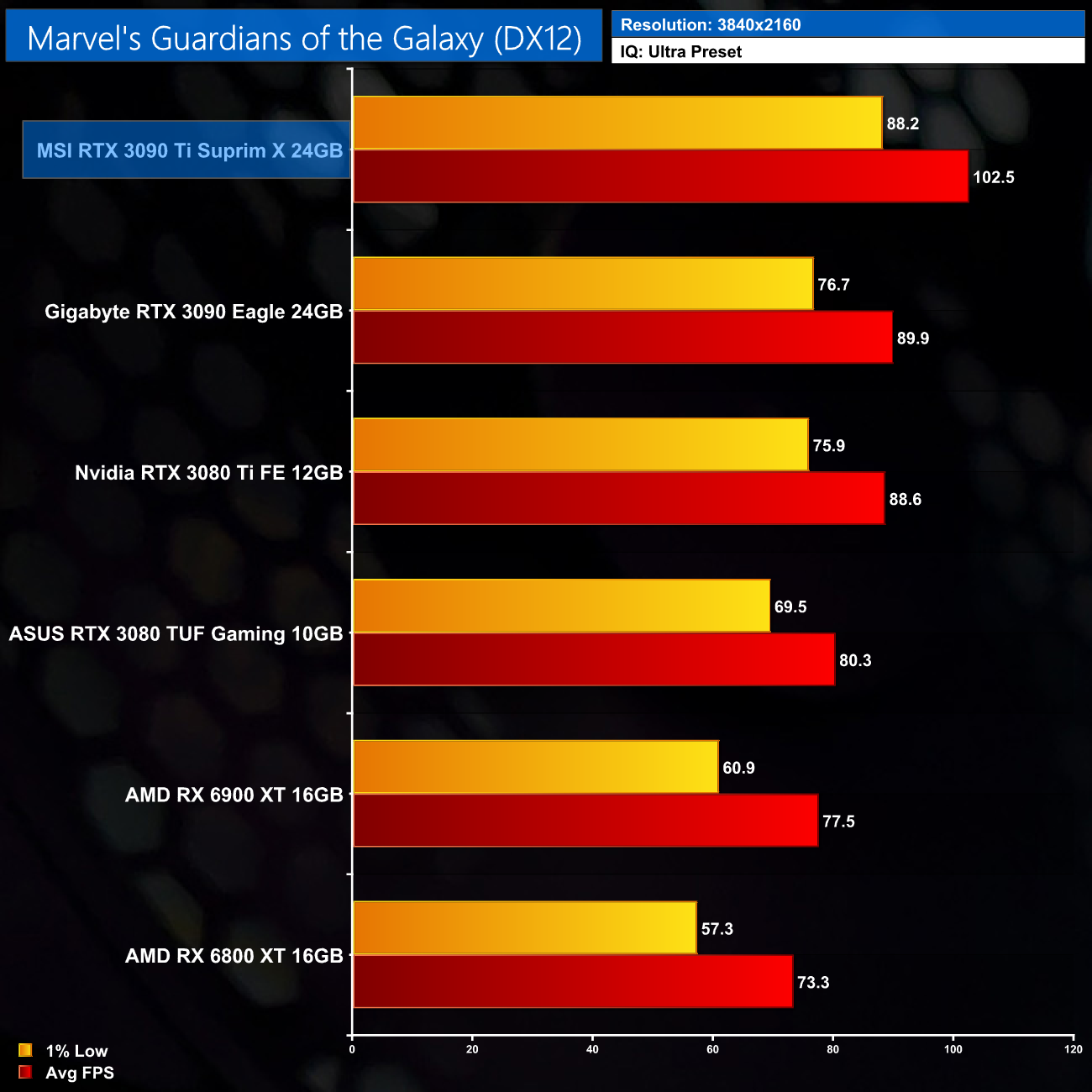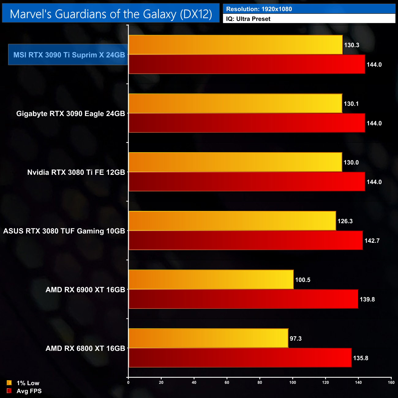 Marvel's Guardians of the Galaxy has a fixed 144FPS cap, and the RTX 3090 Ti is falling foul of that at both 1080p and 1440p. At 4K however, it is no longer constrained and can deliver a 14% boost over the RTX 3090, while it's 32% faster than the RX 6900 XT, which also suffers from noticeably worse 1% lows.