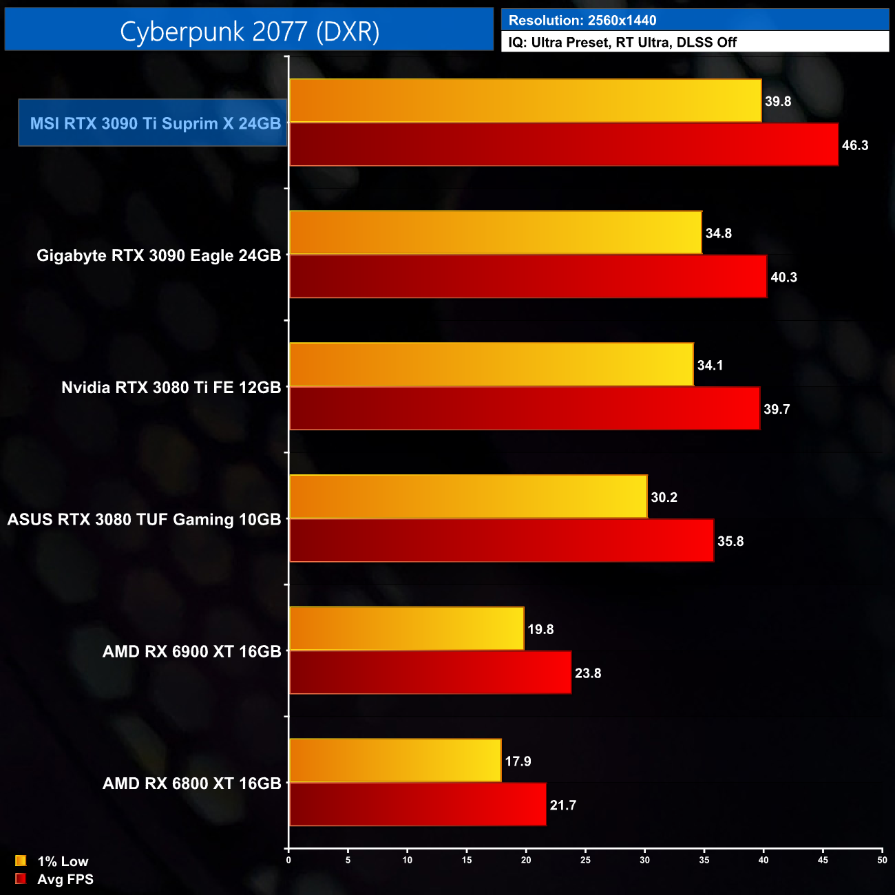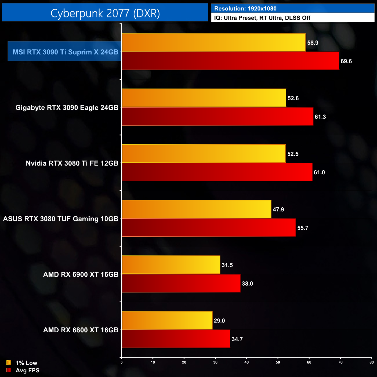 Here we test Cyberpunk 2077, with RT Lighting set to Ultra.