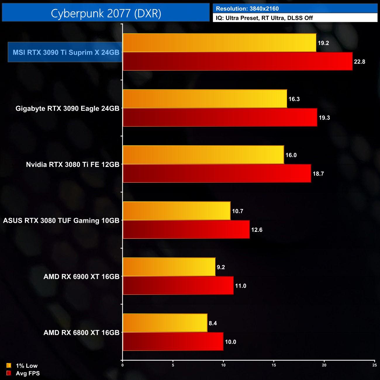 We do see an even bigger 18% boost to performance versus the RTX 3090 when testing at 4K, but the 3090 Ti is only hitting 22.8FPS at that resolution, so it's not a meaningful difference.