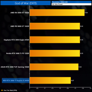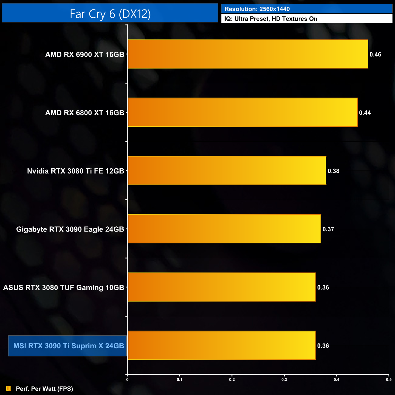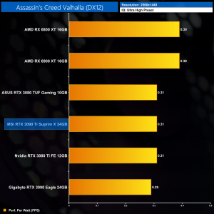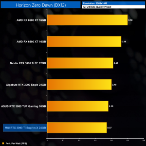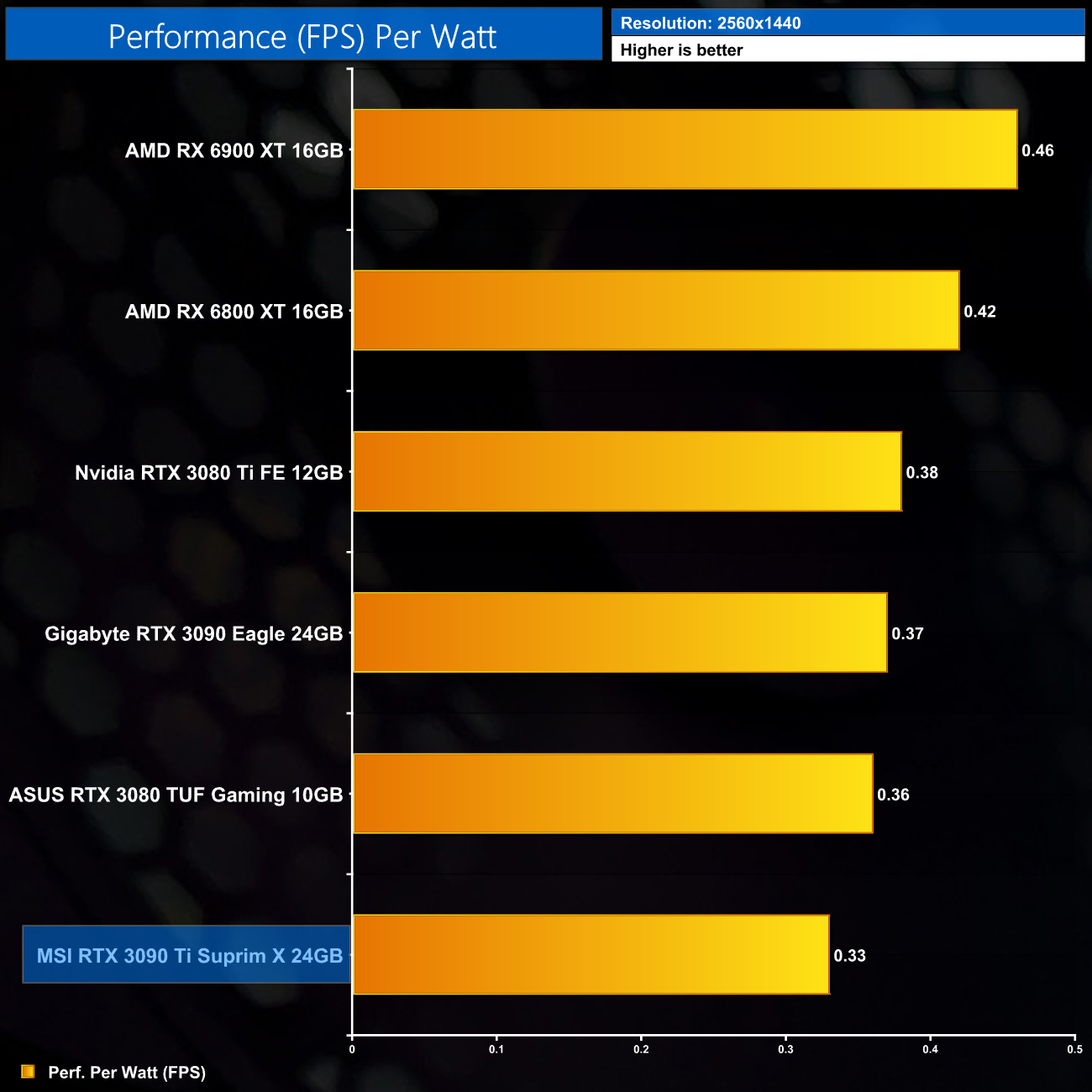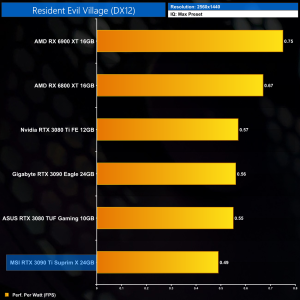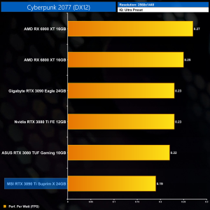 The RTX 3090 Ti still delivers the lowest performance per Watt of any GPU tested, where it is 8% behind the RTX 3080. Compared to the RX 6900 XT, the 3090 Ti delivers 28% less performance per Watt.