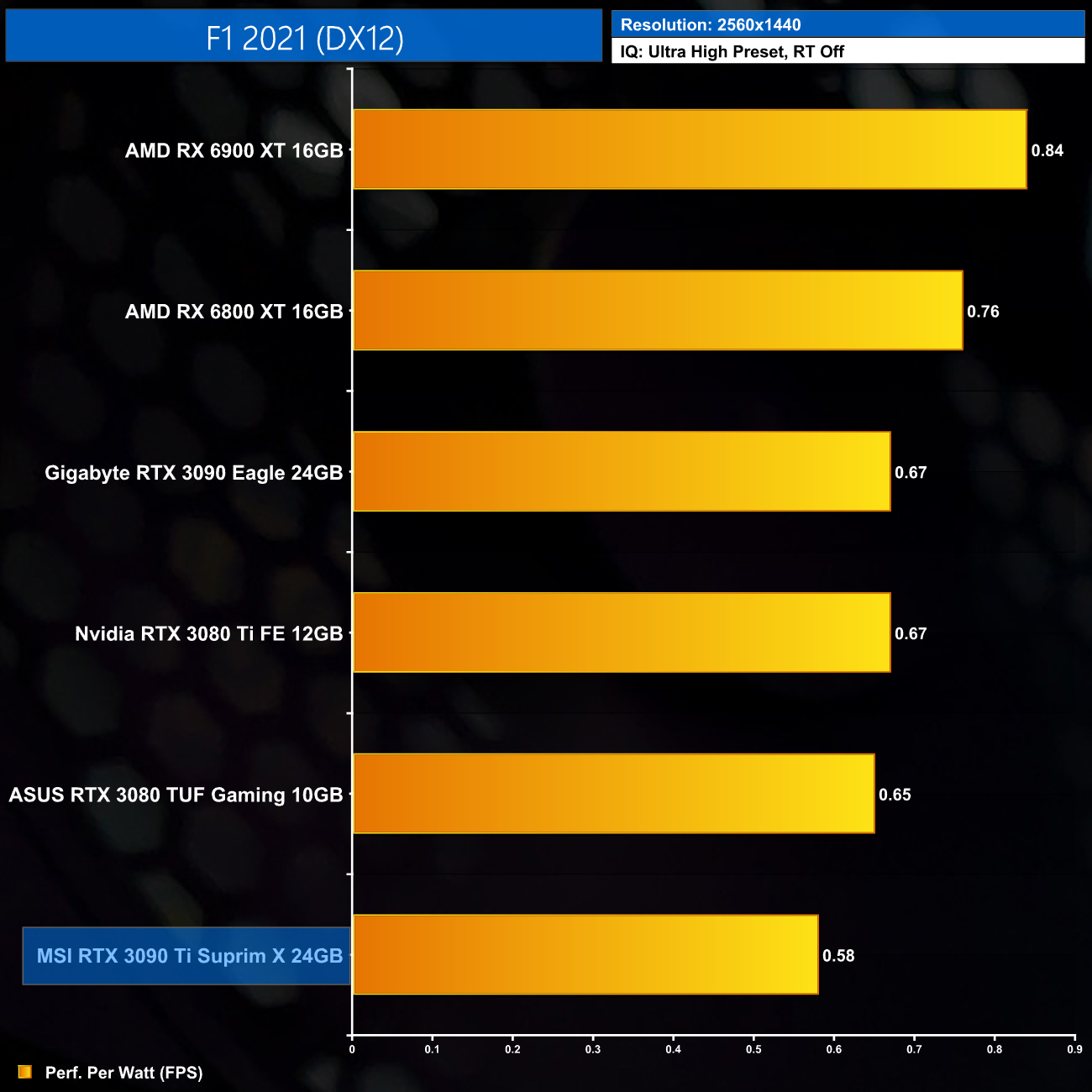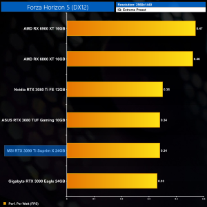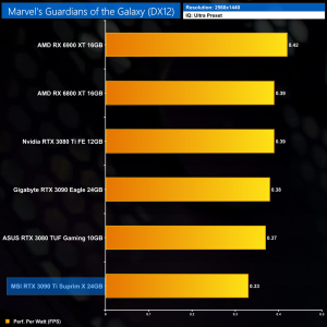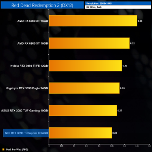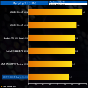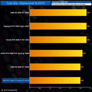 Using the graphics card-only power draw figures presented earlier in the review, here we present performance per Watt on a per-game basis for all twelve games we tested at 1440p.