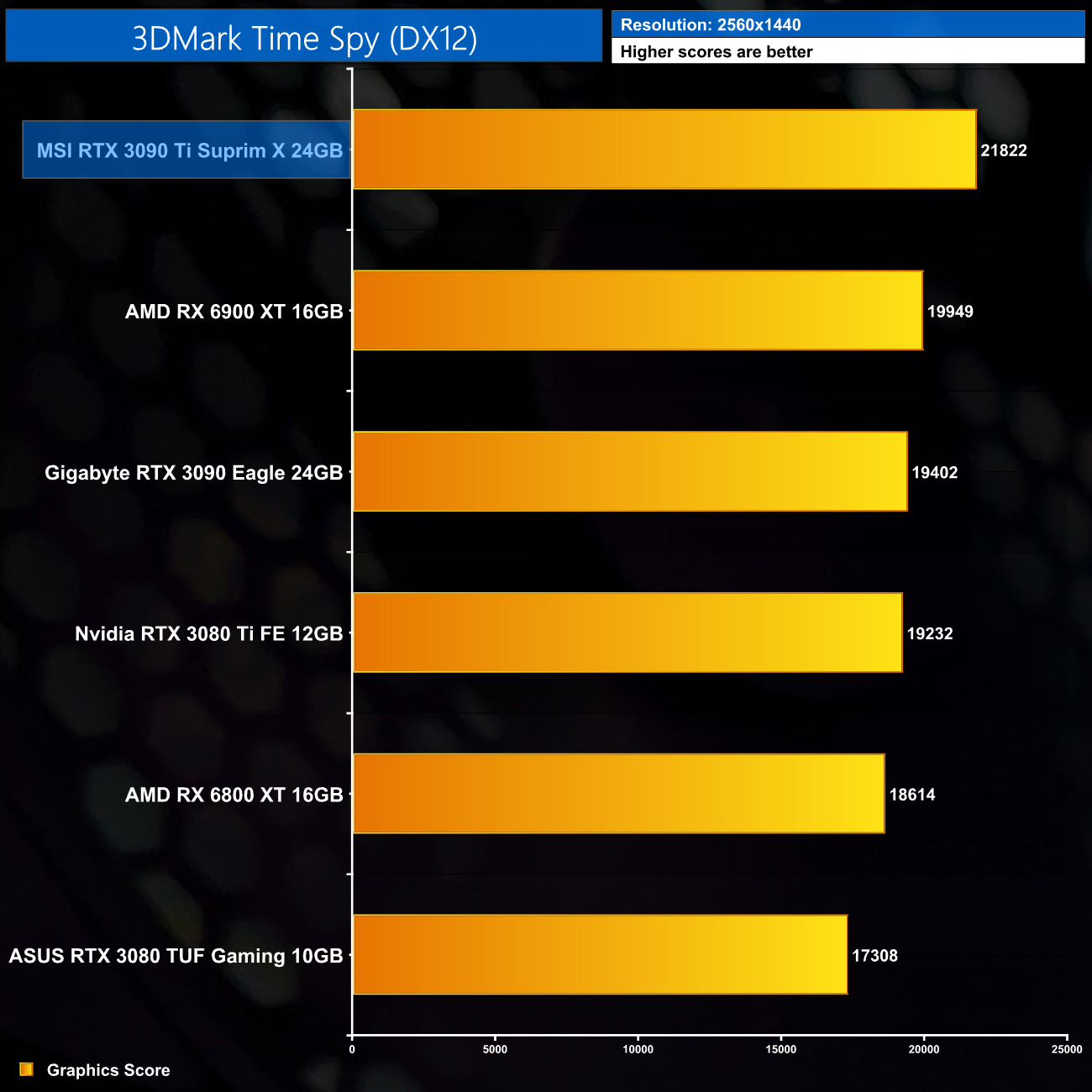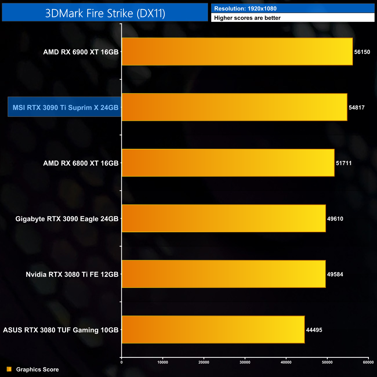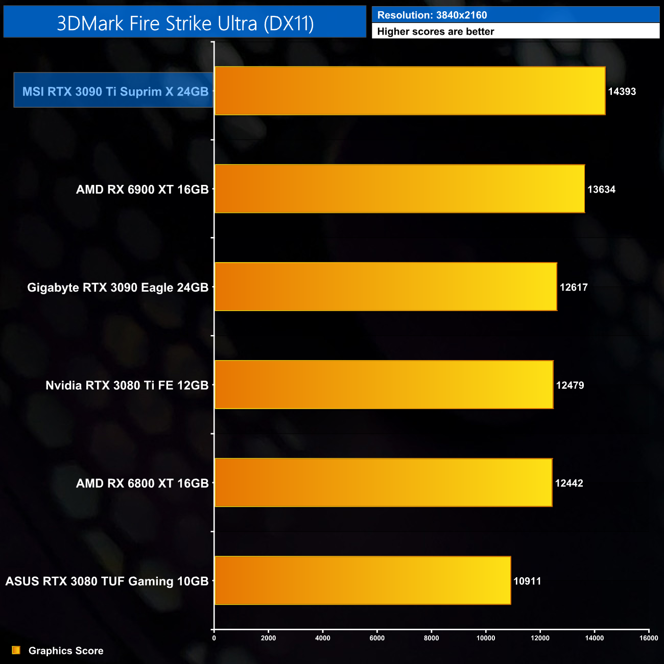Starting with a look at the 3DMark benchmarks, we can see decent results here from the RTX 3090 Ti Suprim X. It's not quite as fast as the RX 6900 XT in Fire Strike, but takes top position in both Time Spy and Fire Strike Ultra, outperforming the RTX 3090 by 14% in the latter of those benchmarks.