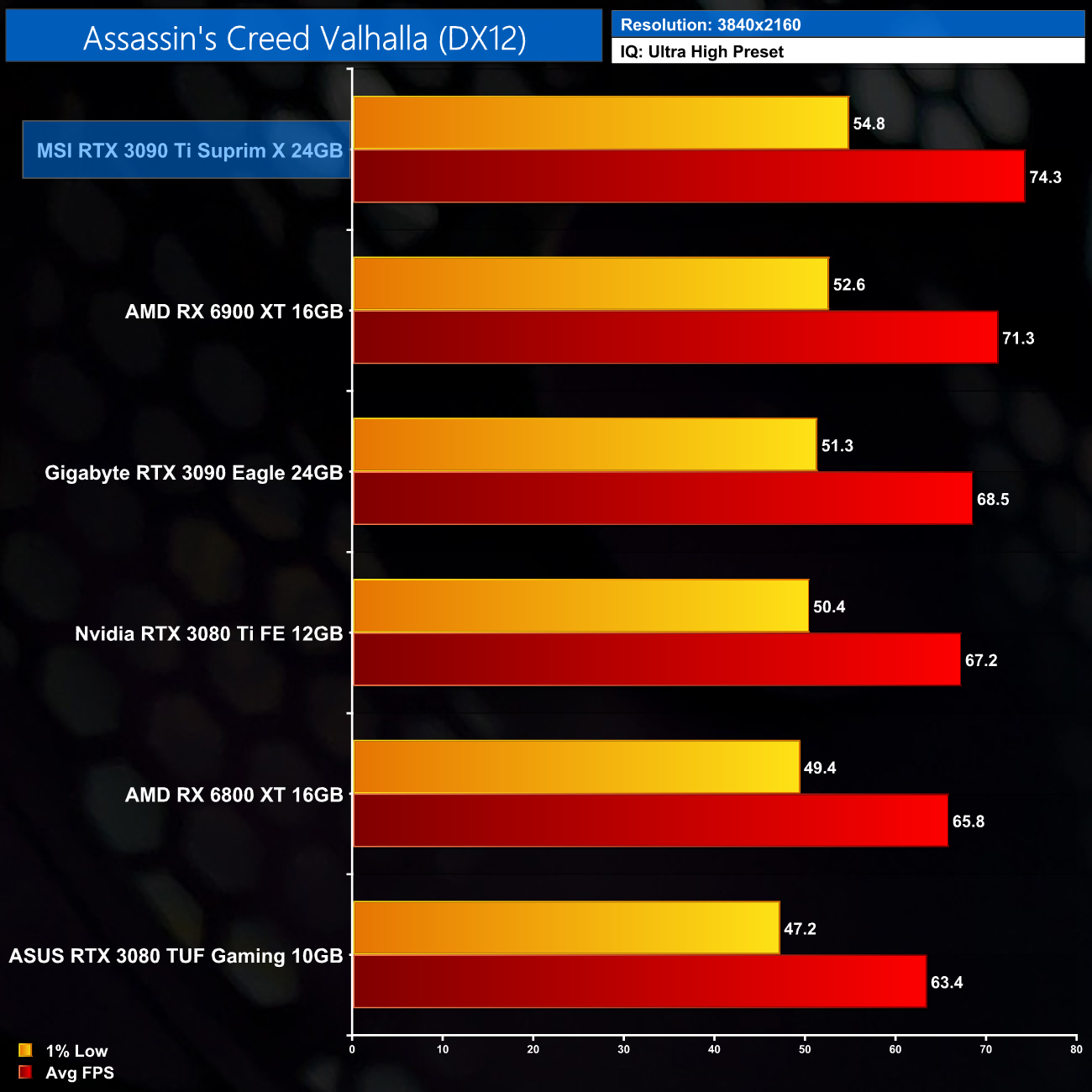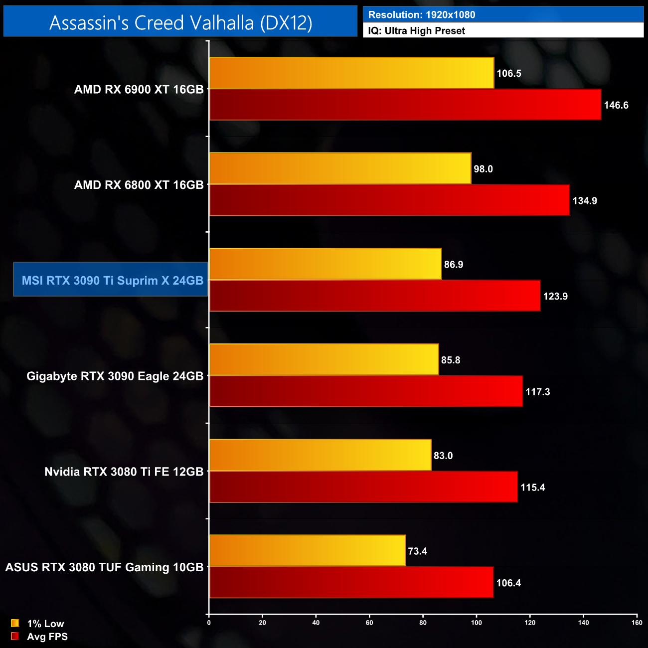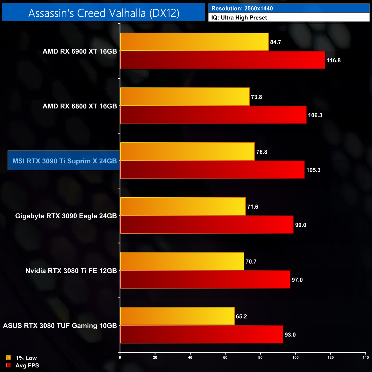 Kicking off the game benchmarks with Assassin's Creed: Valhalla, at 1440p we can see the RTX 3090 Ti Suprim X delivers 105 FPS on average. As AMD GPUs do so well in this game, that only puts it level with the RX 6800 XT and 16% slower than the RX 6900 XT, while it's only 6% faster than the vanilla RTX 3090.