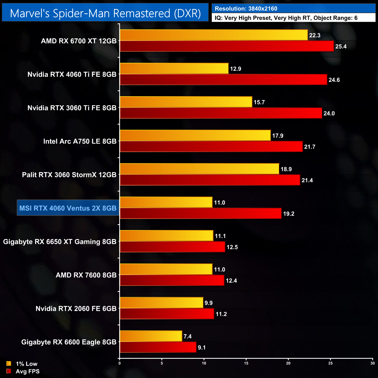 Spider-Man Remastered is next, and with just ray traced reflections, it's not too punishing. The RTX 4060 is able to average 63FPS, and it's 42% faster than the RX 7600. That said, the 1% lows aren't quite as tight as what we see from the likes of the RX 6700 XT – that GPU has a lower average frame rate but higher 1% lows, so it's likely we're looking at the start of a VRAM limitation here. A quick look at the 1440p data also suggests the same – the gap between the 1% lows and average frame rate is much wider than even the RTX 3060.