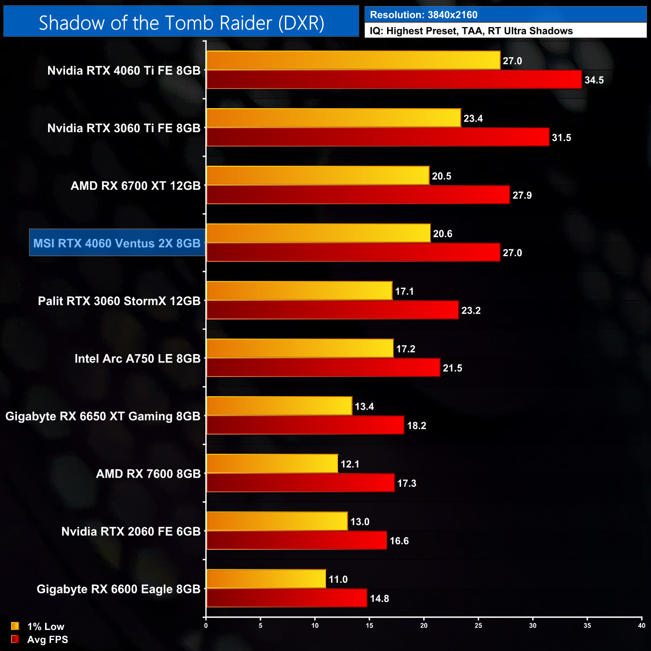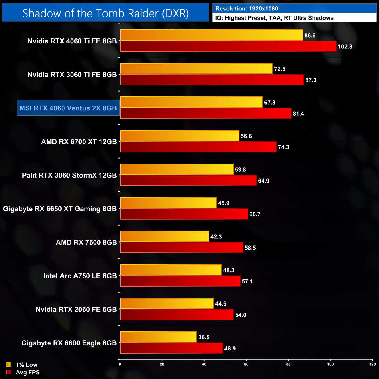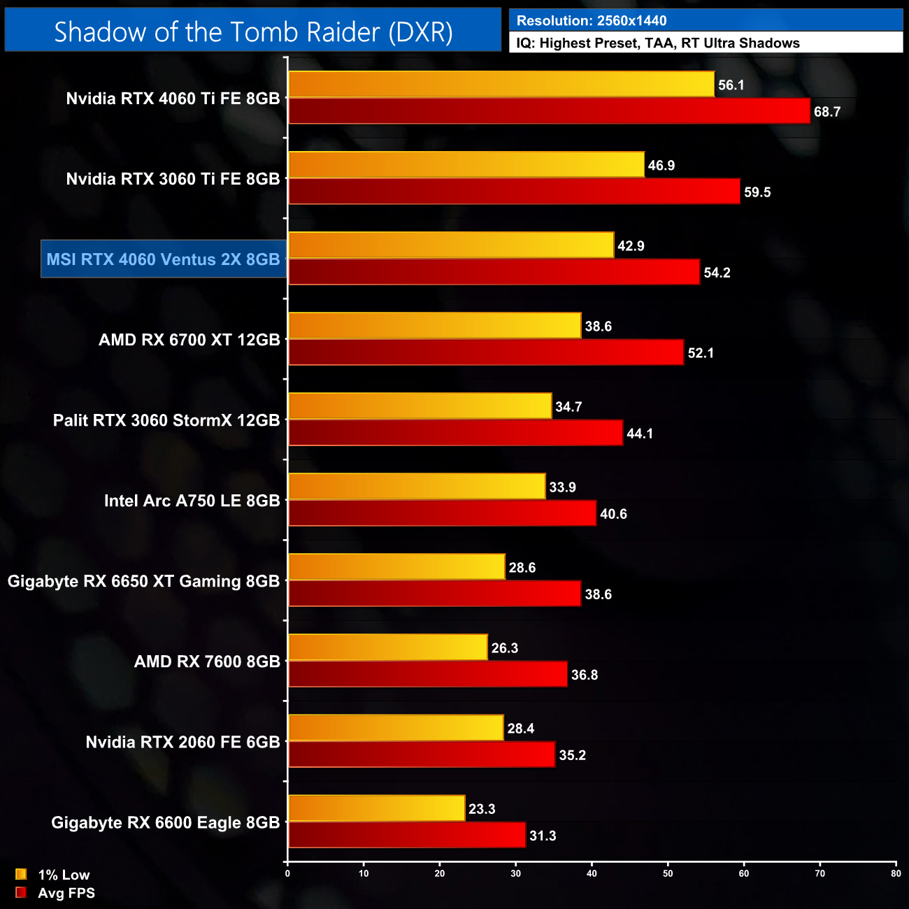 We've brought back Shadow of the Tomb Raider here, as one of the first games with ray tracing it's interesting to see how RT performance has developed over the last 5 years. Utilising just ray traced shadows, modern hardware makes relatively light work of it, with the RTX 4060 averaging over 80FPS at 1080p. That makes it 39% faster than the RX 7600, and it's even 10% faster than the RX 6700 XT.