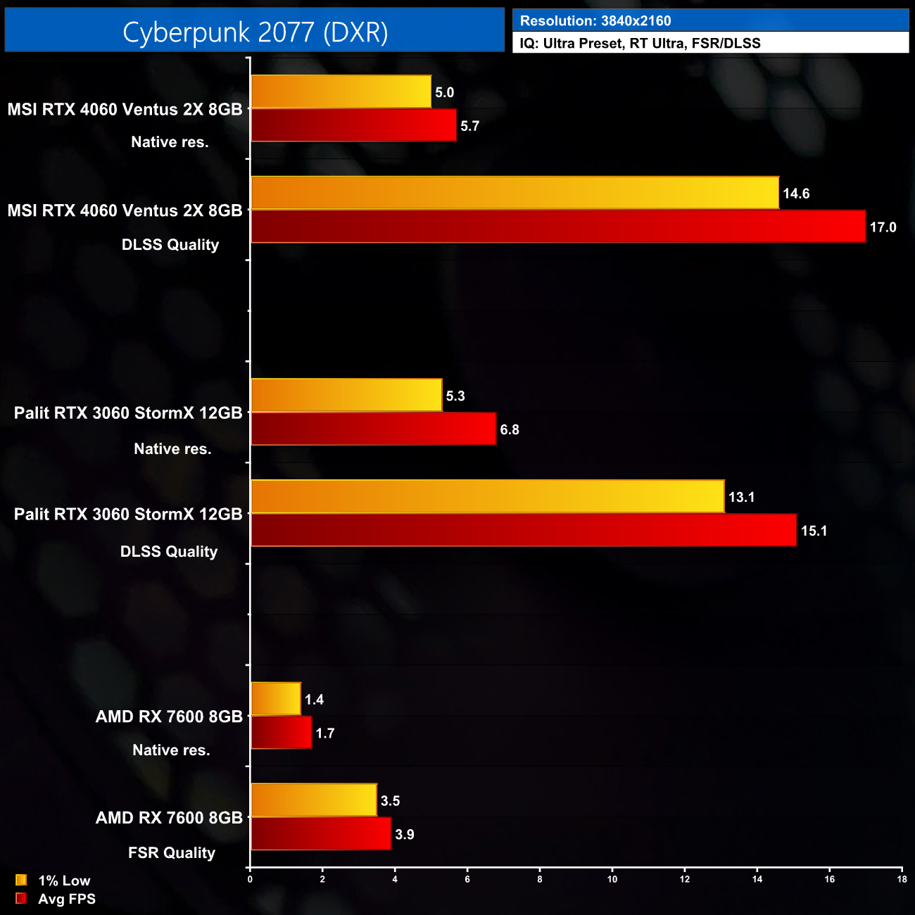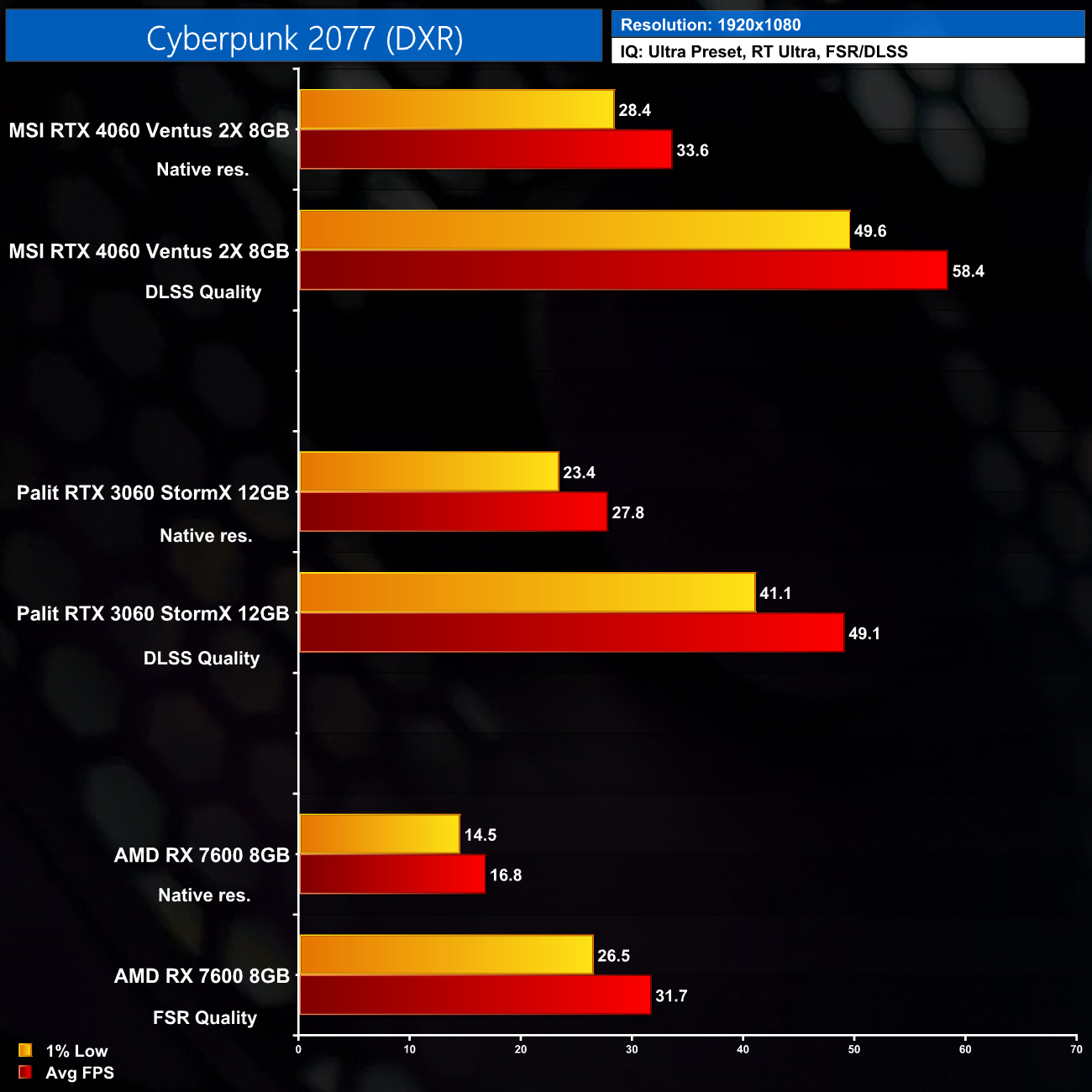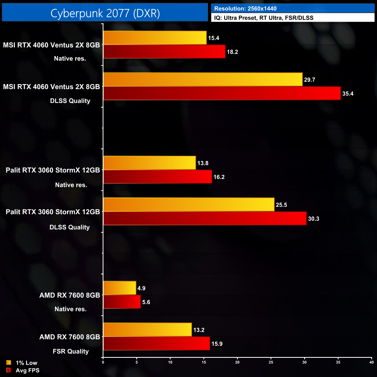 Even then, at 1440p DLSS 2 isn't enough to get the 4060 to hold above 30FPS, with the 1% lows just a hair below that baseline.