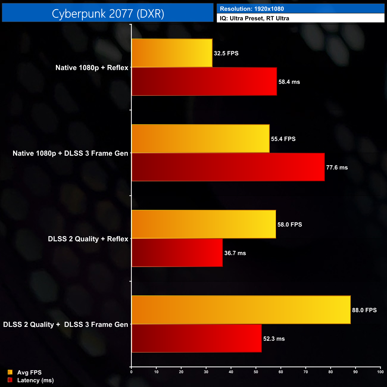 DLSS 3 Frame Generation is another feature worth testing, where we look at enabling Frame Generation on its own, and then with the technology used in conjunction with DLSS 2 Super resolution. Frame Gen on its own gives a boost up to 55FPS, so it's broadly as performant as DLSS 2 Quality mode, though the latency is noticeably higher (77.6ms with Frame Gen compared to 36.7ms with DLSS 2 Quality.) Enabling both together reduces latency to 52.3ms, so that's slightly better than native, but with the frame rate boosted up to 88FPS.