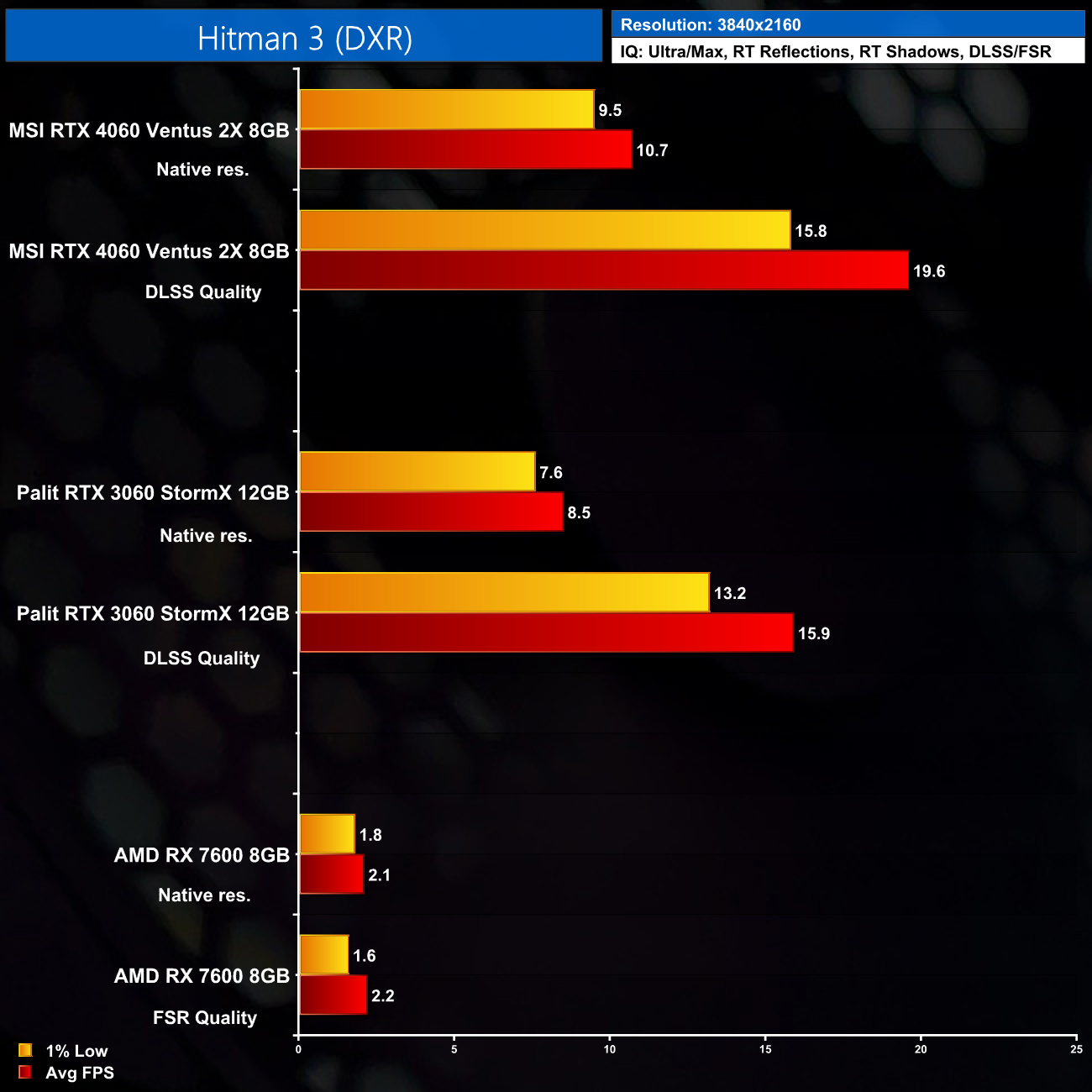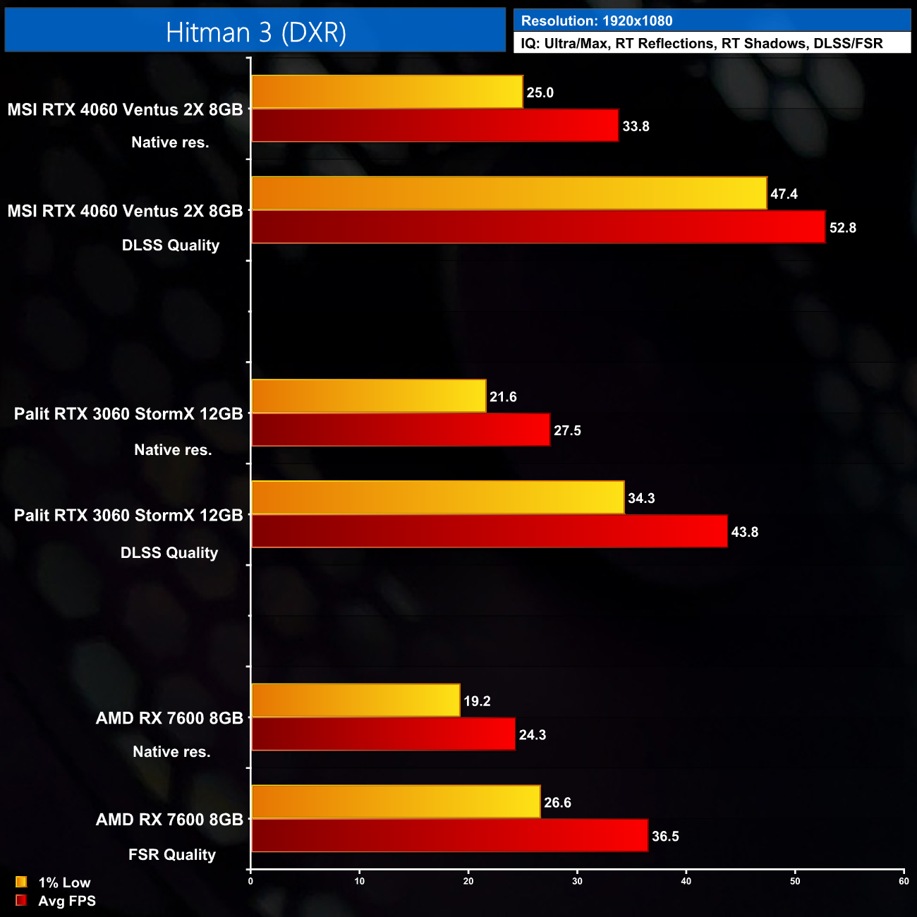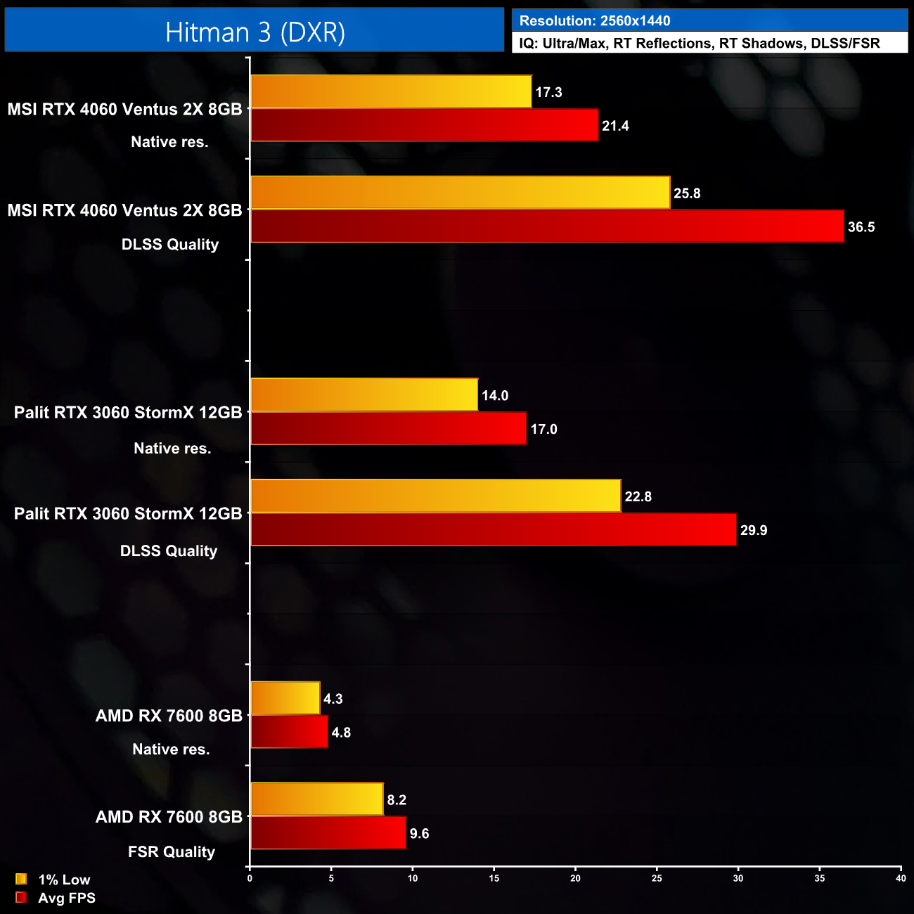 Next is Hitman 3, where DLSS 2 Quality mode brings a very healthy 56% boost to frame rates, once more taking the RTX 4060 from a sub-30FPS experience and bringing the 1% lows to 47FPS. It's still not enough to get the 4060 over the 30FPS line at 1440p when using max ray tracing settings, but a couple of tweaks to the settings should make it workable.