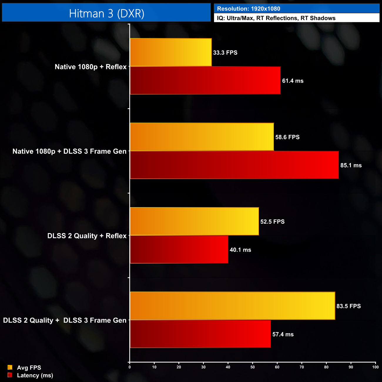 Hitman 3 also supports DLSS 3 Frame Gen, with similar scaling when compared to Cyberpunk 2077. Using just Frame Gen on its own sees the frame rate hit 59FPS, so it's slightly faster than DLSS 2 Super Resolution, albeit with double the latency. Frame Gen plus DLSS Super Resolution brings latency to just below native figures, while the frame rate is well over double what we get without any form of AI upscaling.