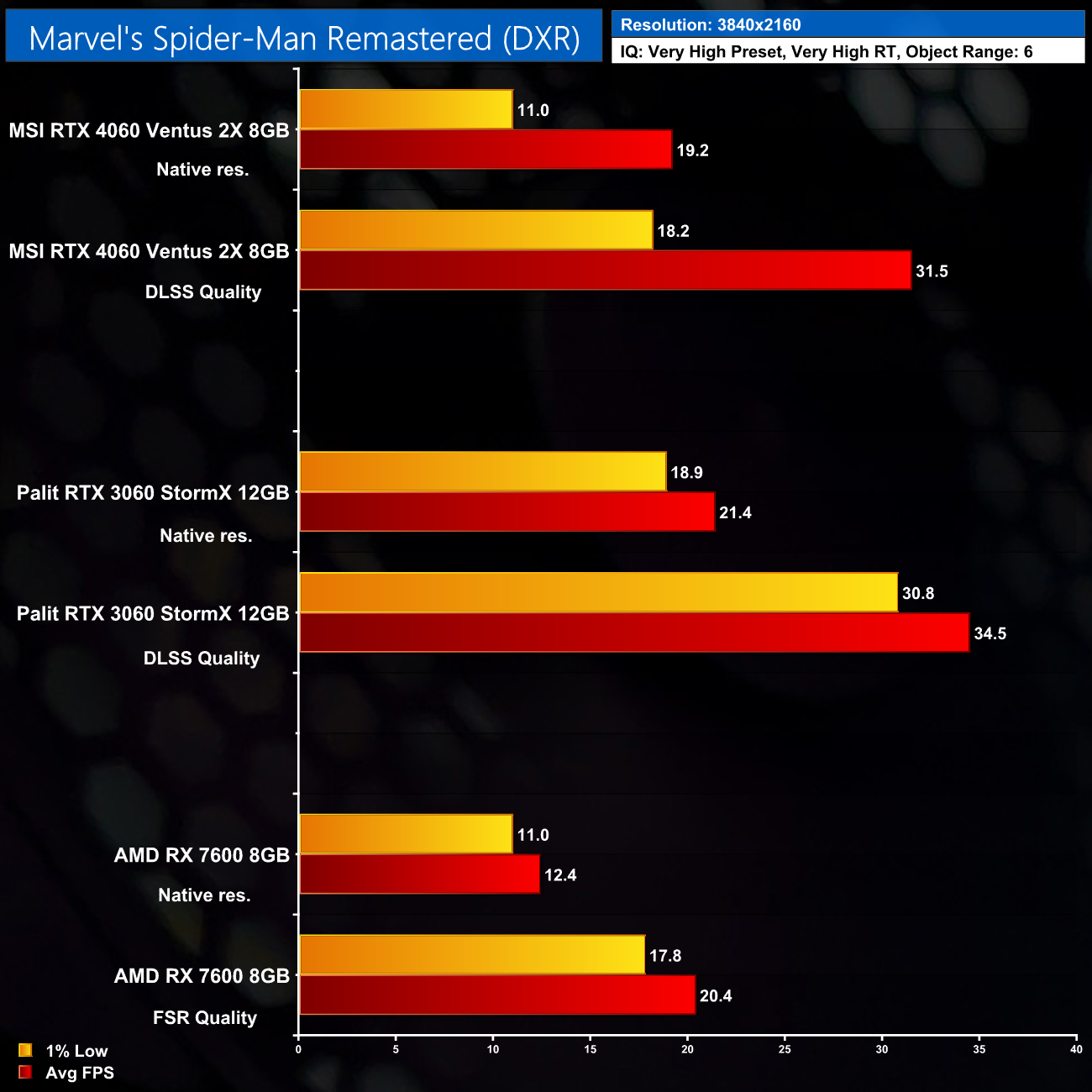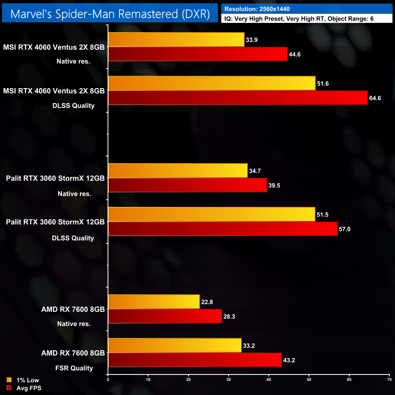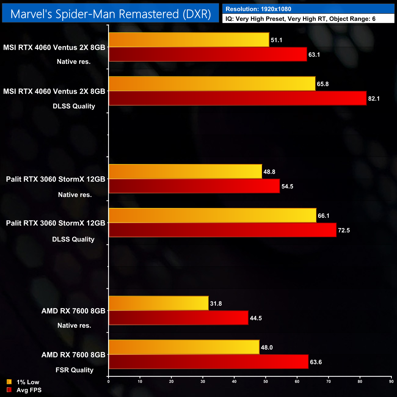 Lastly we have Spider-Man Remastered, where DLSS 2 Quality provides a smaller boost of around 30% at 1080p, though that is still welcome. That increases to a 44% uplift at 1440p, but we can clearly see the 1% lows aren't quite as tight as with the RTX 3060 – another example of VRAM limits just starting to reduce performance. It's only slight, but it is noticeable.
