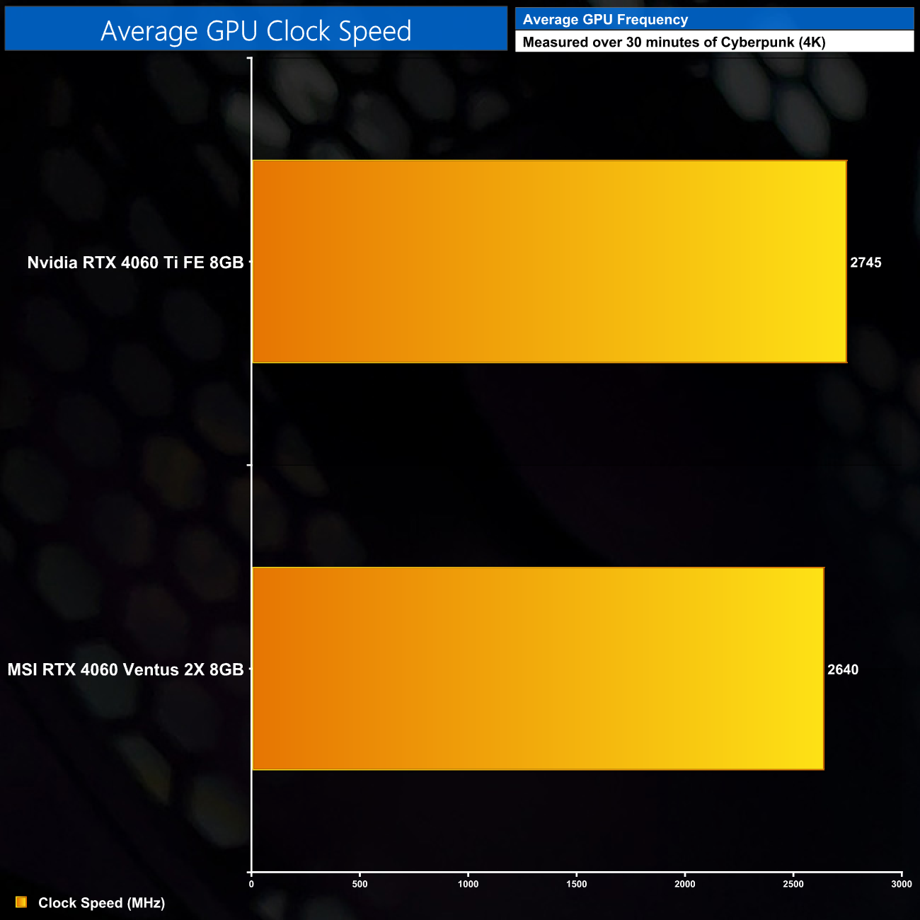 We've not tested any other RTX 4060 models other than the MSI Ventus 2X, but just to give you an idea of how it stacks up, we have included the RTX 4060 Ti in the above bar graph. The RTX 4060 does clock in a touch lower overall, hitting 2640MHz over our 30 minute stress test, compared to 2745MHz for the RTX 4060 Ti.