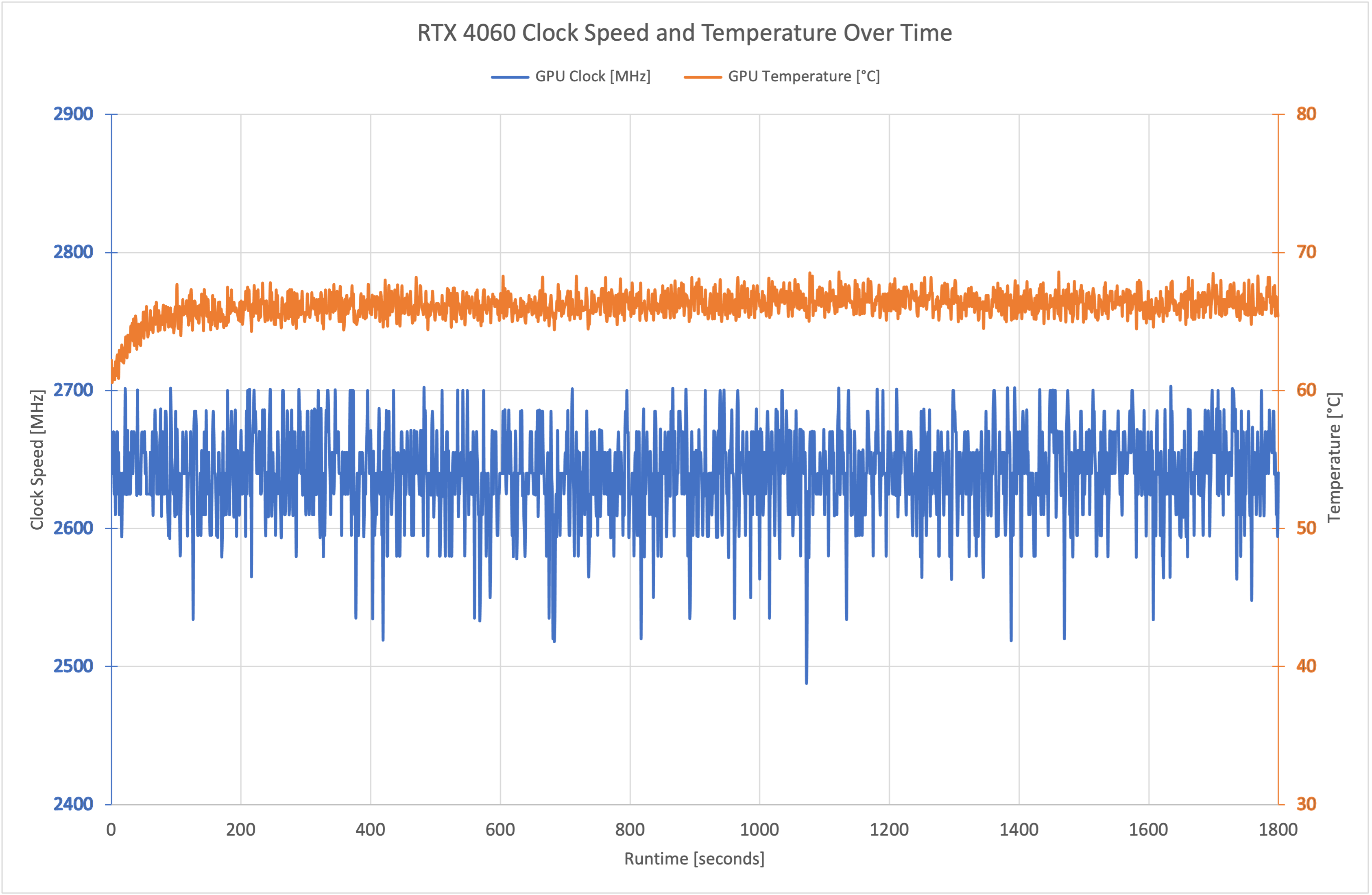 Interestingly, the clock speed is much more dynamic with the RTX 4060 as it appears to be more power-limited. The RTX 4060 Ti is almost entirely voltage limited and would often run at a locked 2745MHz. Not so for the 4060, the frequency clearly fluctuates, dropping below 2500MHz at points, before boosting back up into the 2650MHz range.