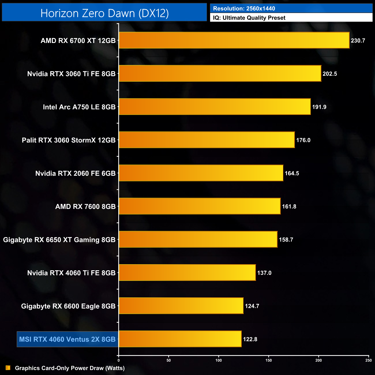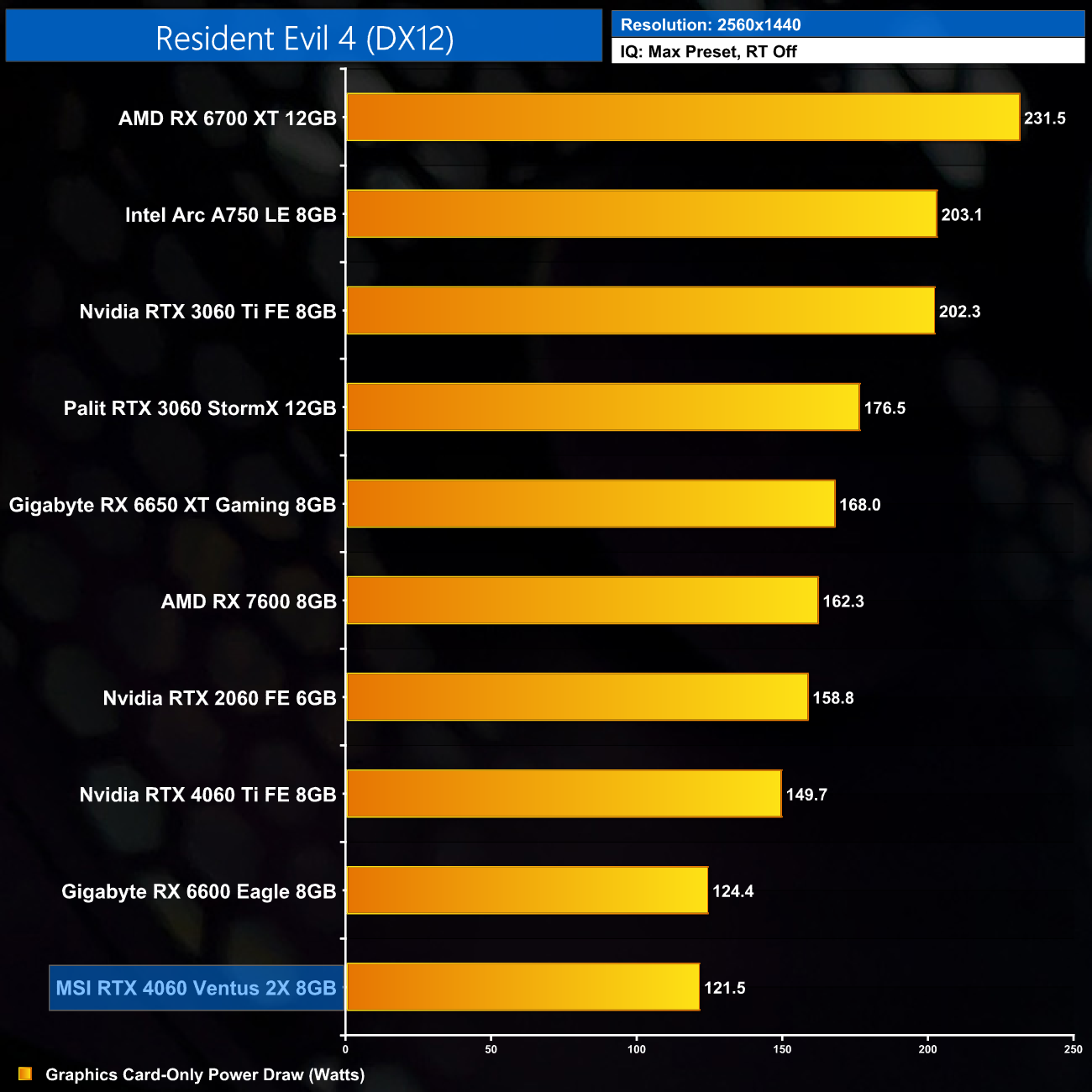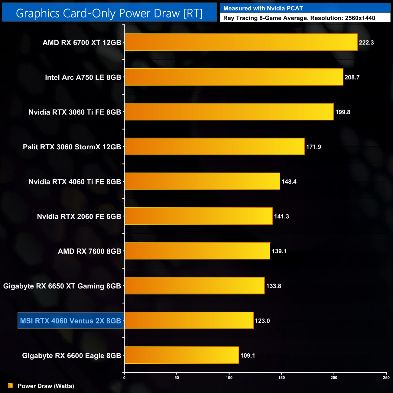 Up at 1440p we see power has climbed just a touch, up to 122.2W on average. This puts it just below the RX 6600, despite being significantly faster overall, and it's still roughly 40W less power-hungry than the RX 7600.