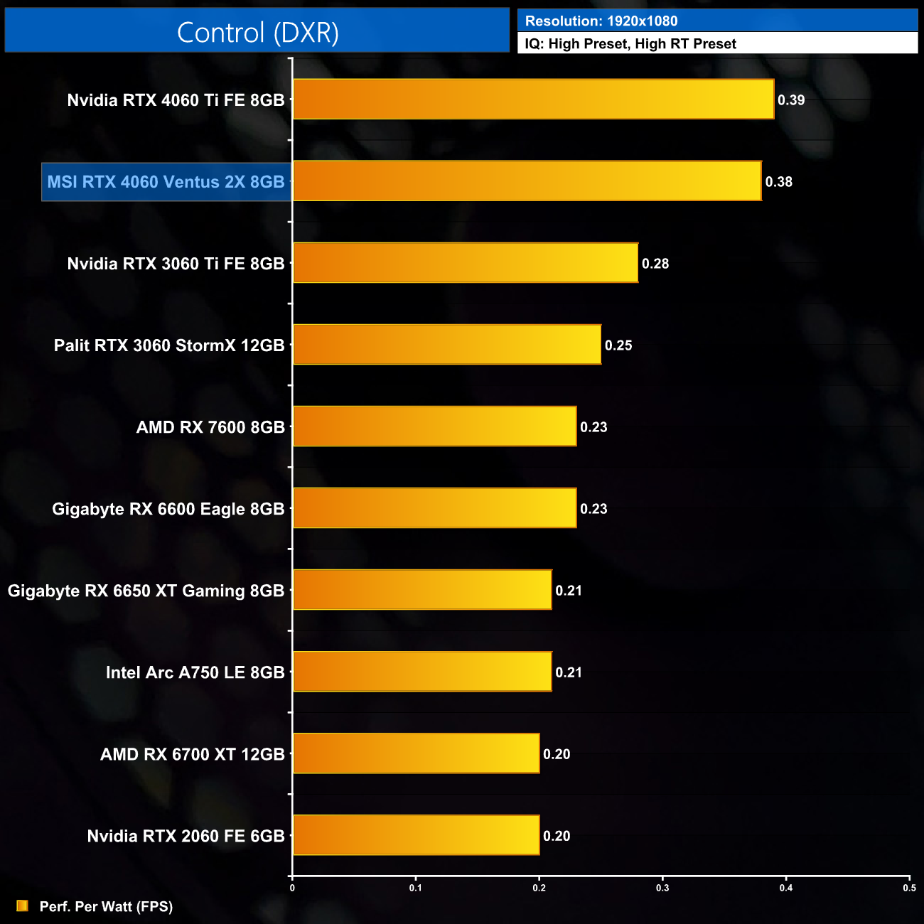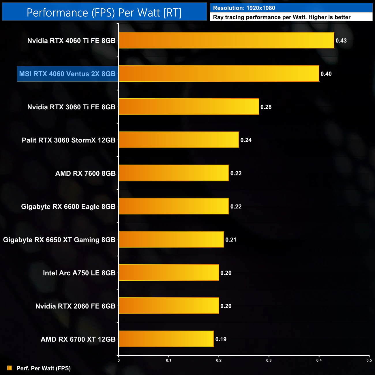 We see similar results when looking at the ray tracing average, but this time the 4060 is almost twice as efficient as the RX 7600 due to its superior ray tracing performance while also offering lower power draw.