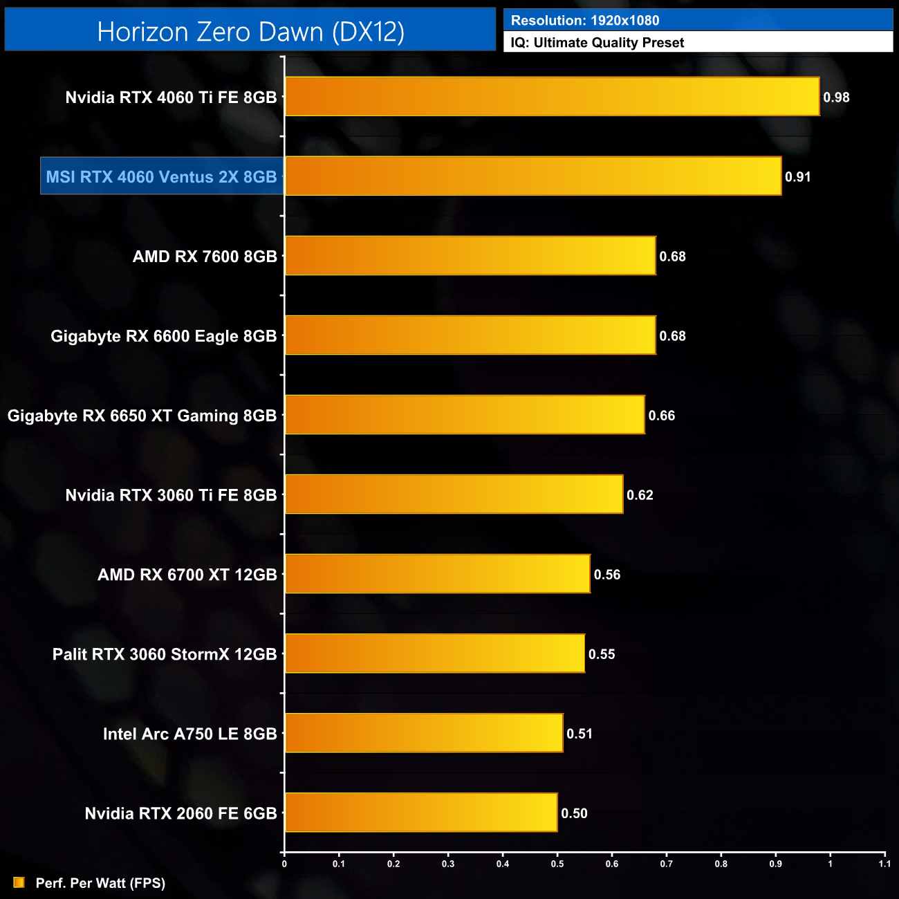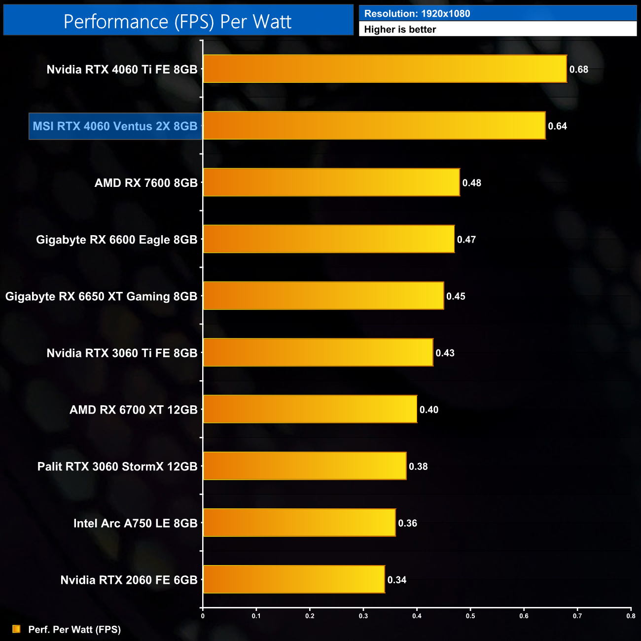 Combining the performance and power data, we take a look at efficiency levels – presented here as performance per Watt. We know Ada Lovelace is a very efficient architecture, though the 4060 isn't quite as impressive as the 4060 Ti here, as performance per Watt is actually reduced by 6%. We're talking fine margins though, and it is still a generation ahead of the RX 7600, offering 33% better efficiency than AMD's latest GPU.