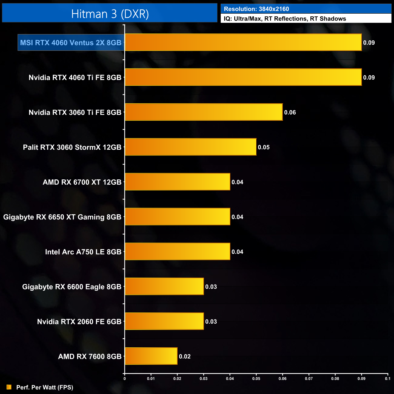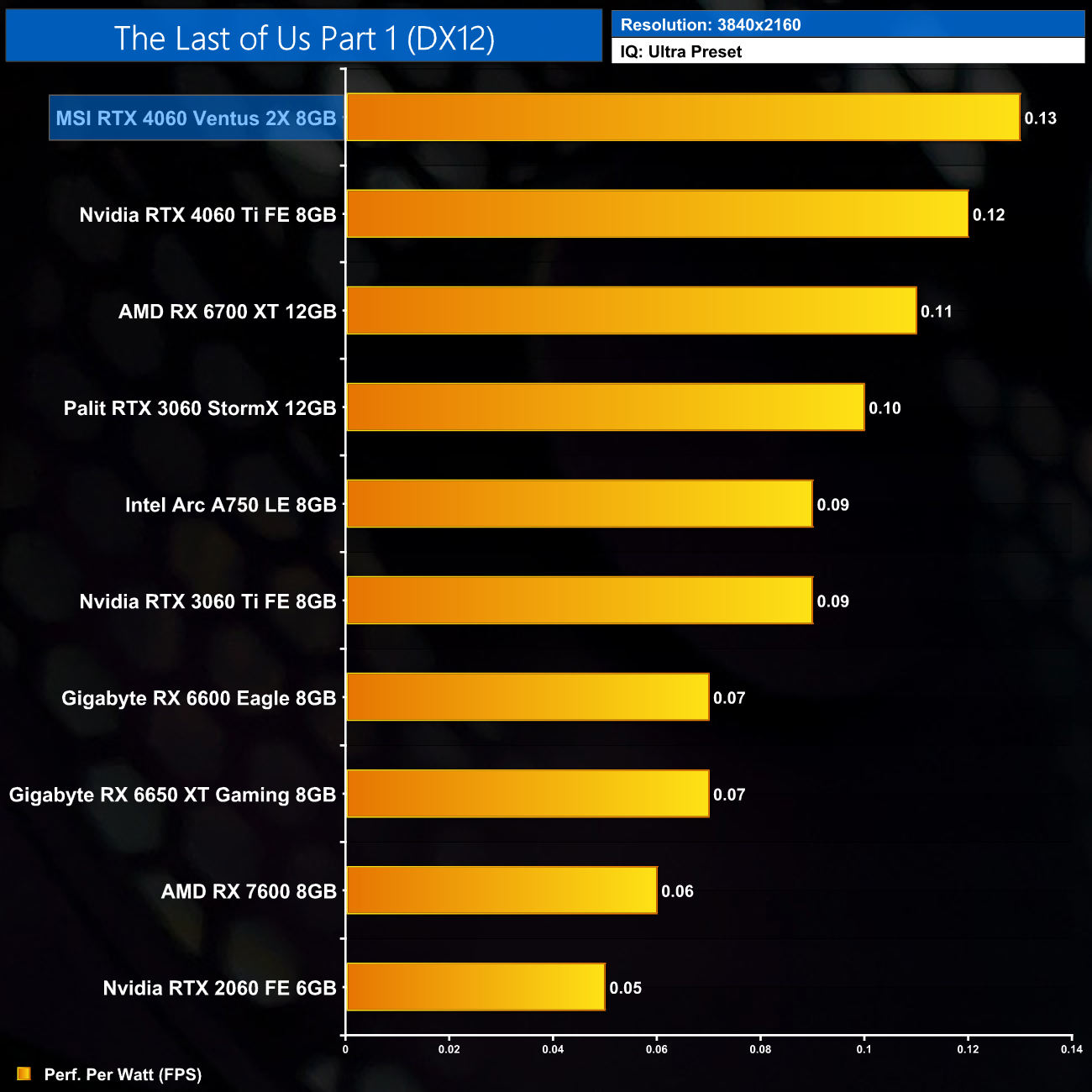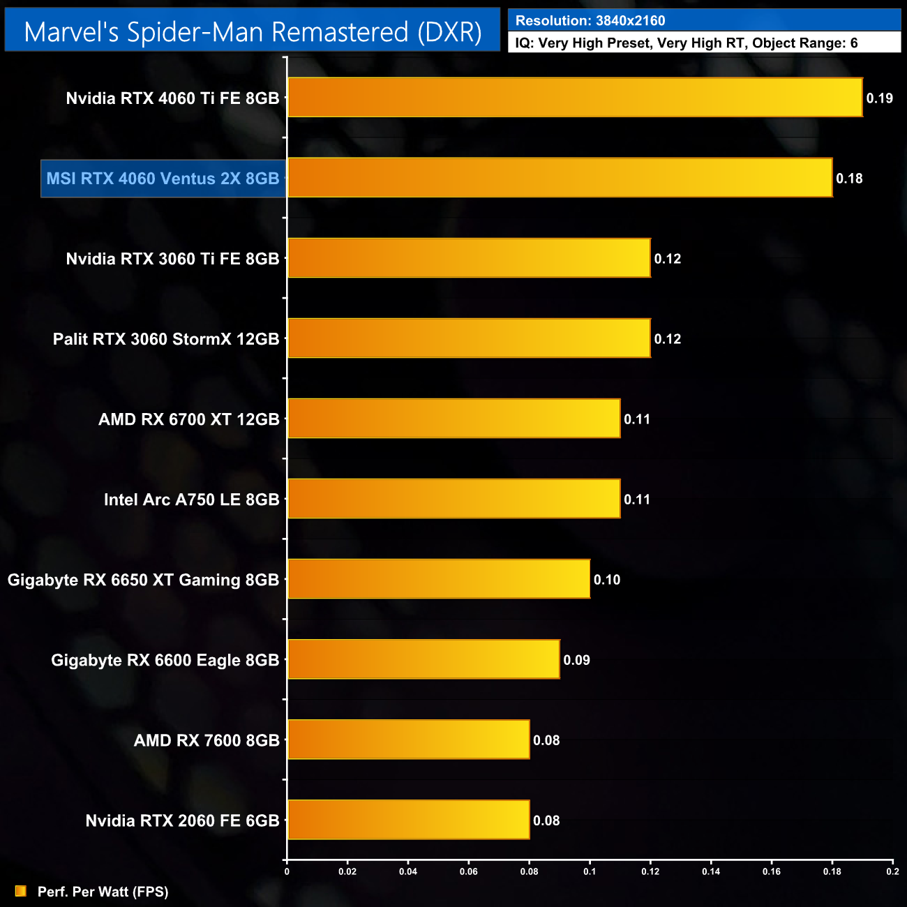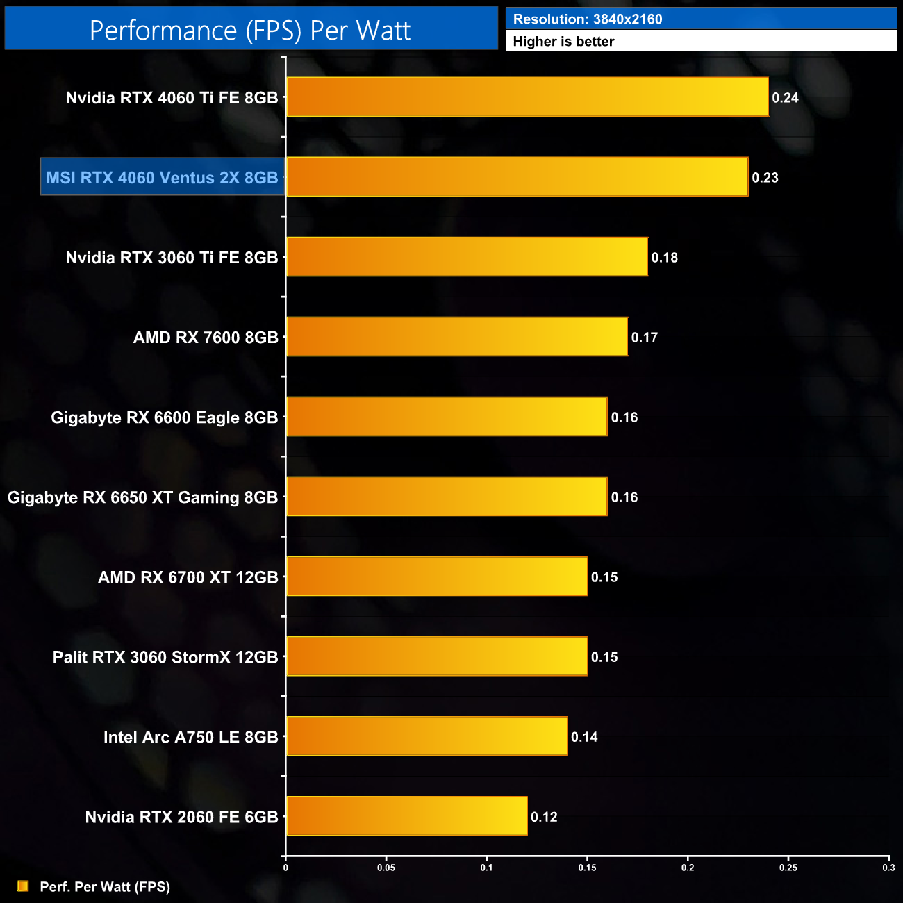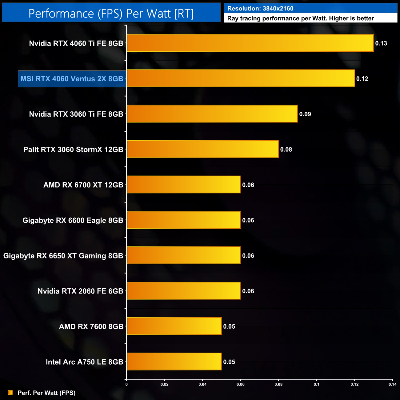 Likewise, you are never going to enable ray tracing at 4K with the RTX 4060… but if you did, this is the efficiency you'd see.