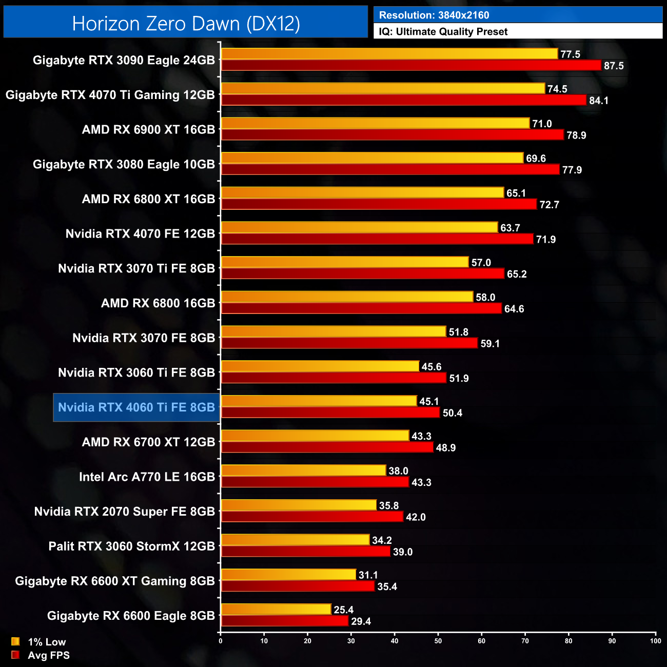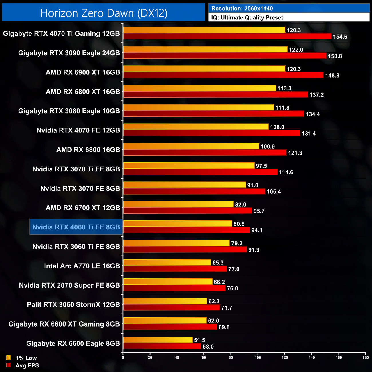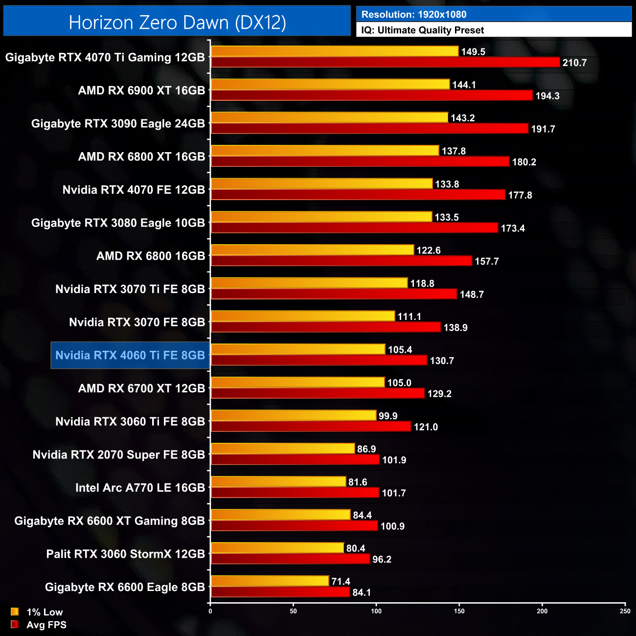 The disappointment continues with Horizon Zero Dawn, where the RTX 3060 Ti is good for 131FPS. That's just an 8% uplift against the 3060 Ti though, while it's level pegging with AMD's RX 6700 XT.