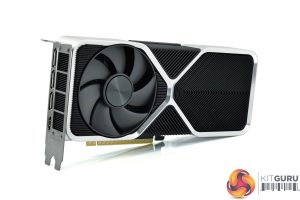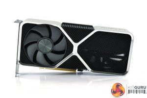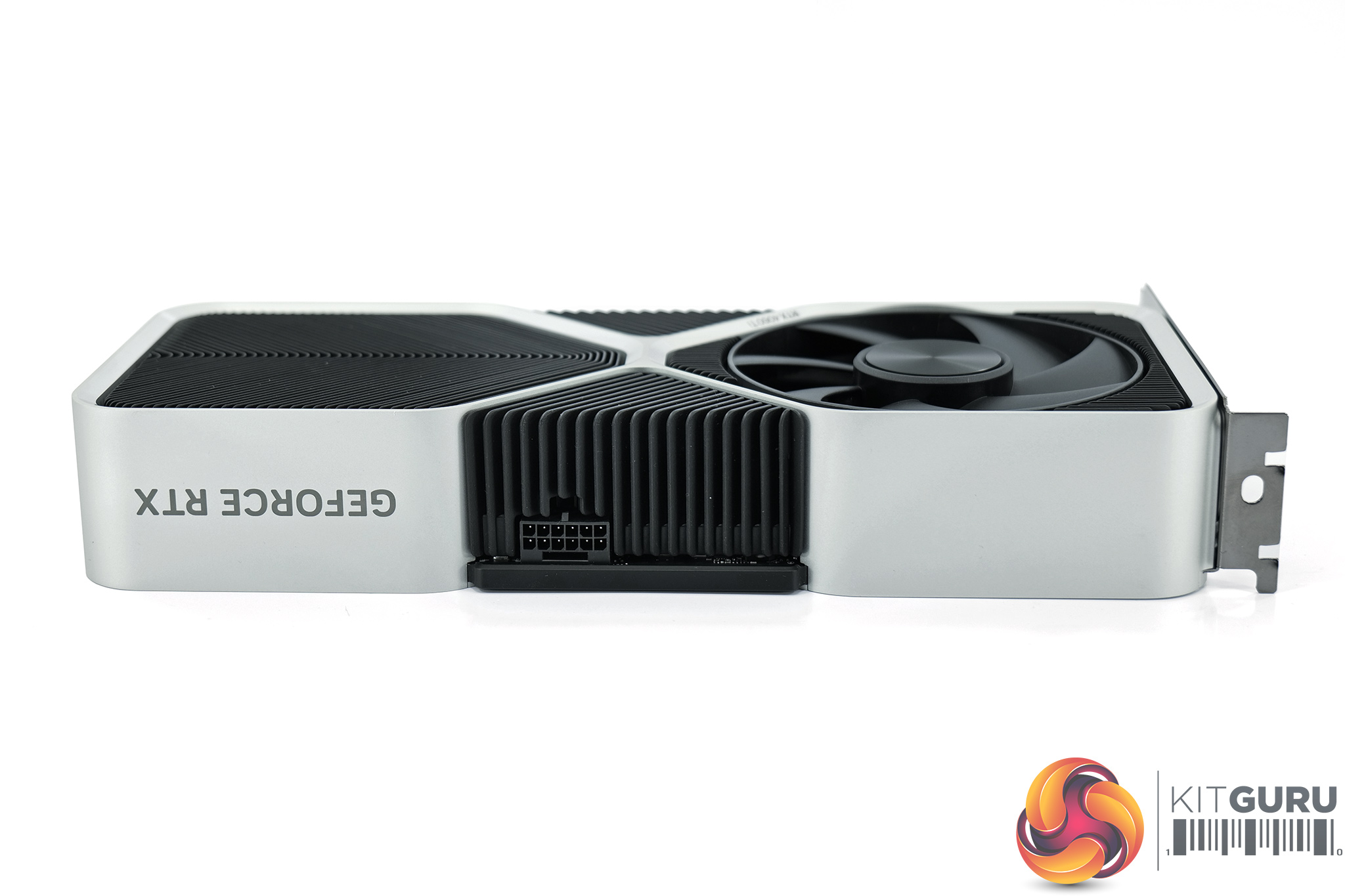 The side of the card is fairly plain, with the new silver metal frame on show, along with some aluminium heatsink fins. The GeForce RTX branding is also present here towards the end of the card.