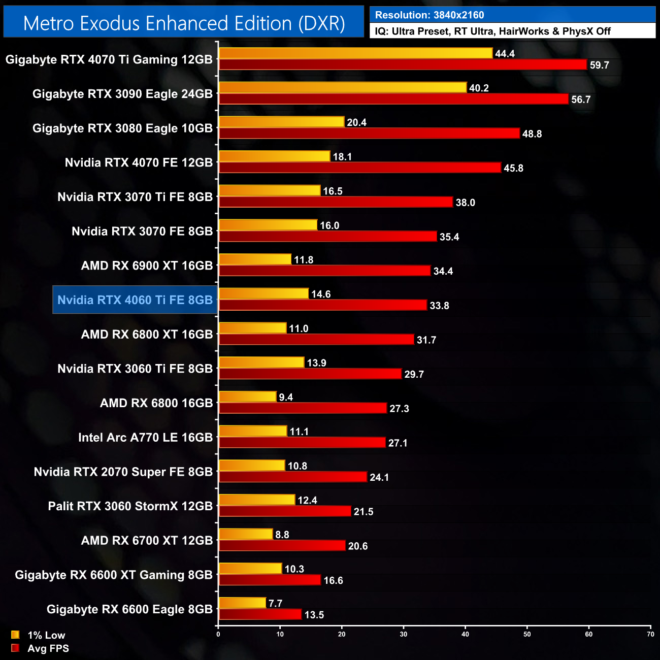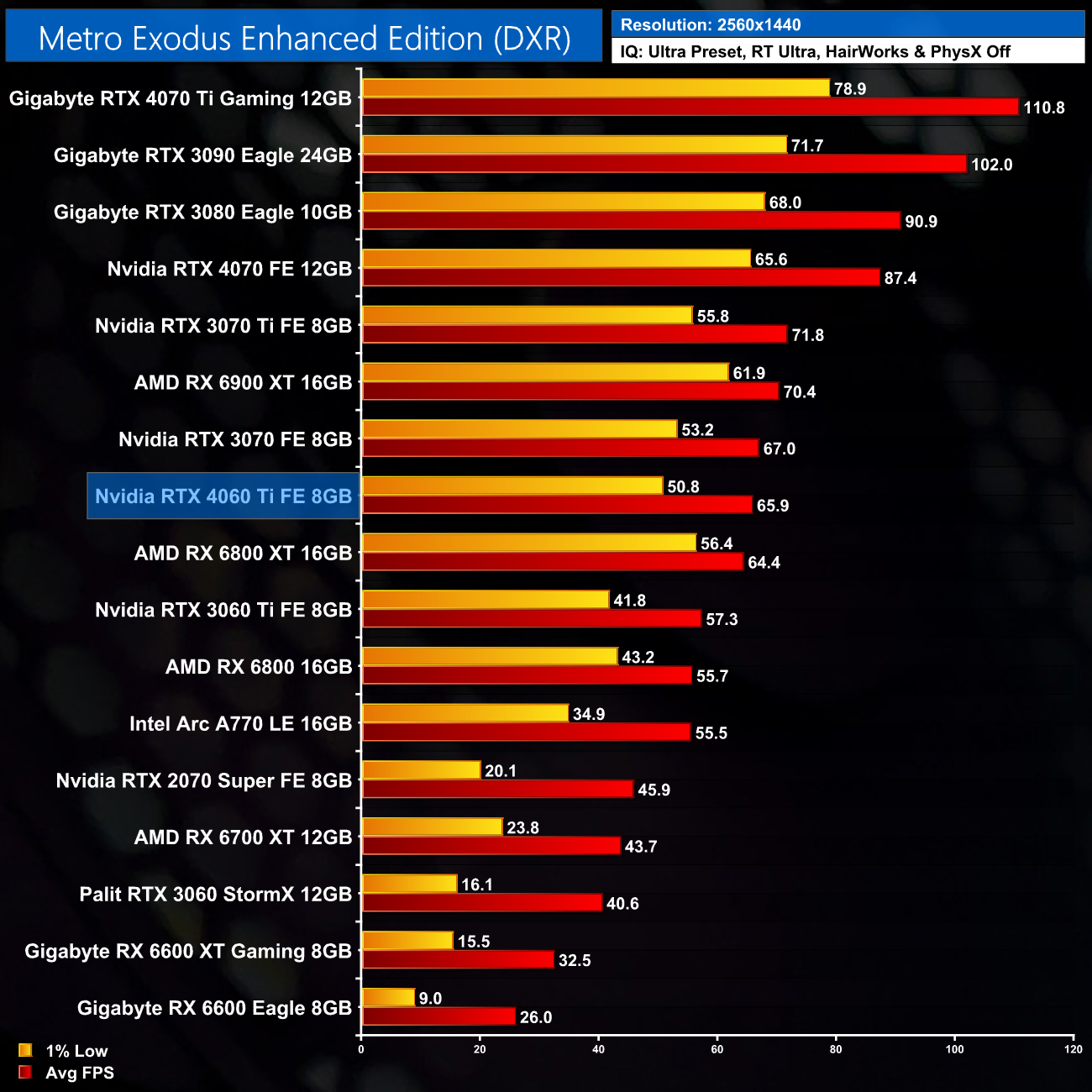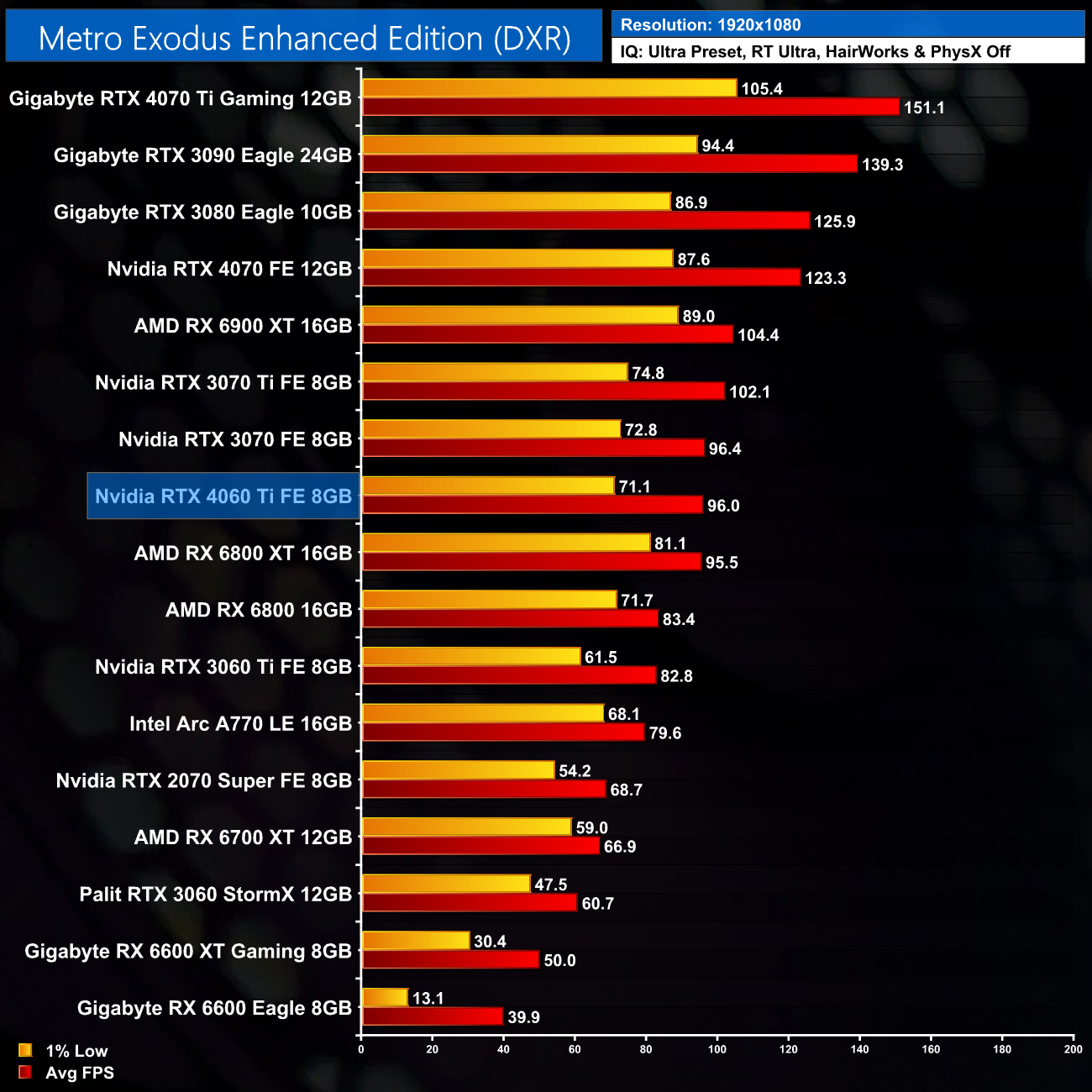 Lastly, Metro Exodus Enhanced Edition sees the 4060 Ti deliver an average frame rate of 96FPS, a 16% advantage over the RTX 3060 Ti. That puts it level with the RX 6800 XT however, a testament to Nvidia's ray tracing prowess.