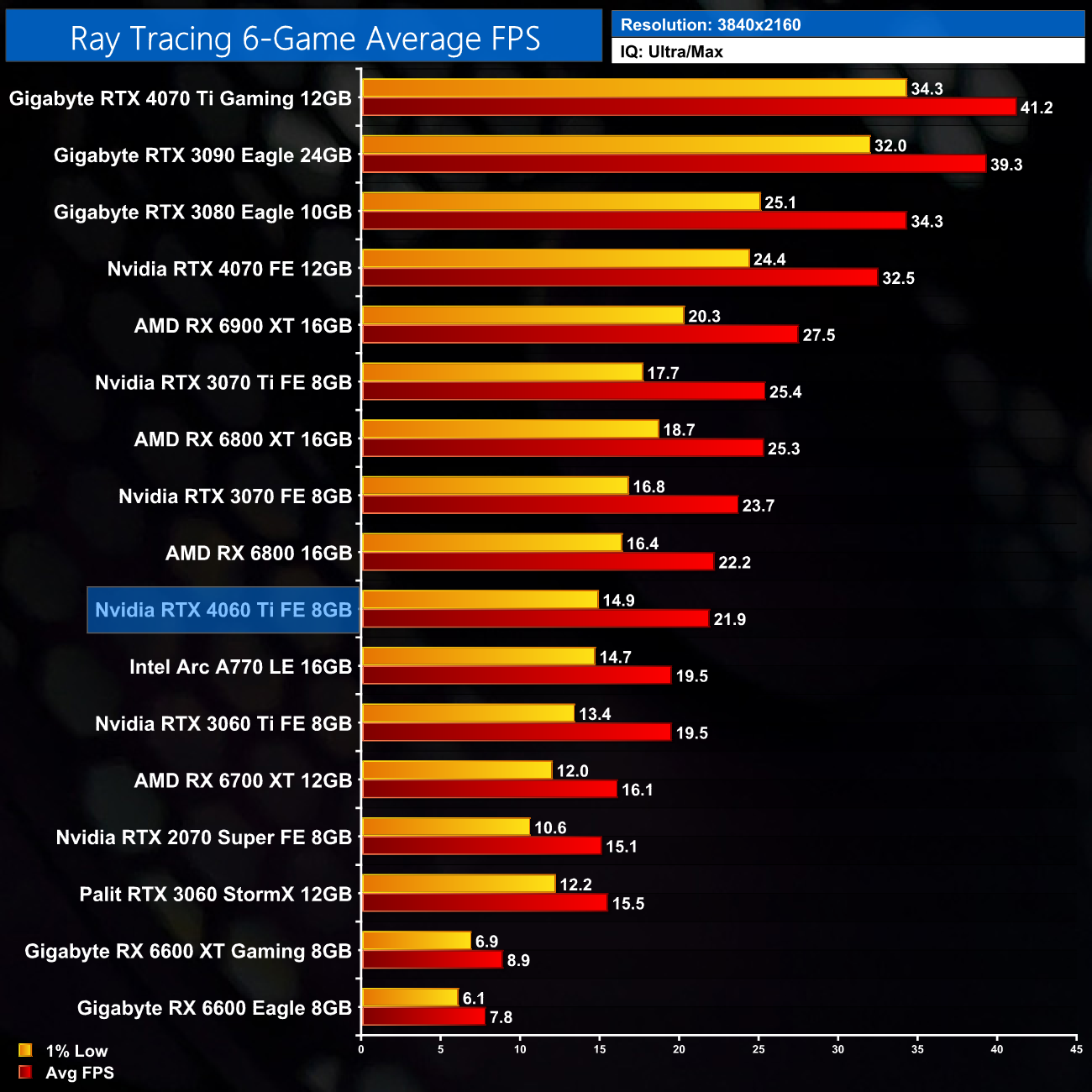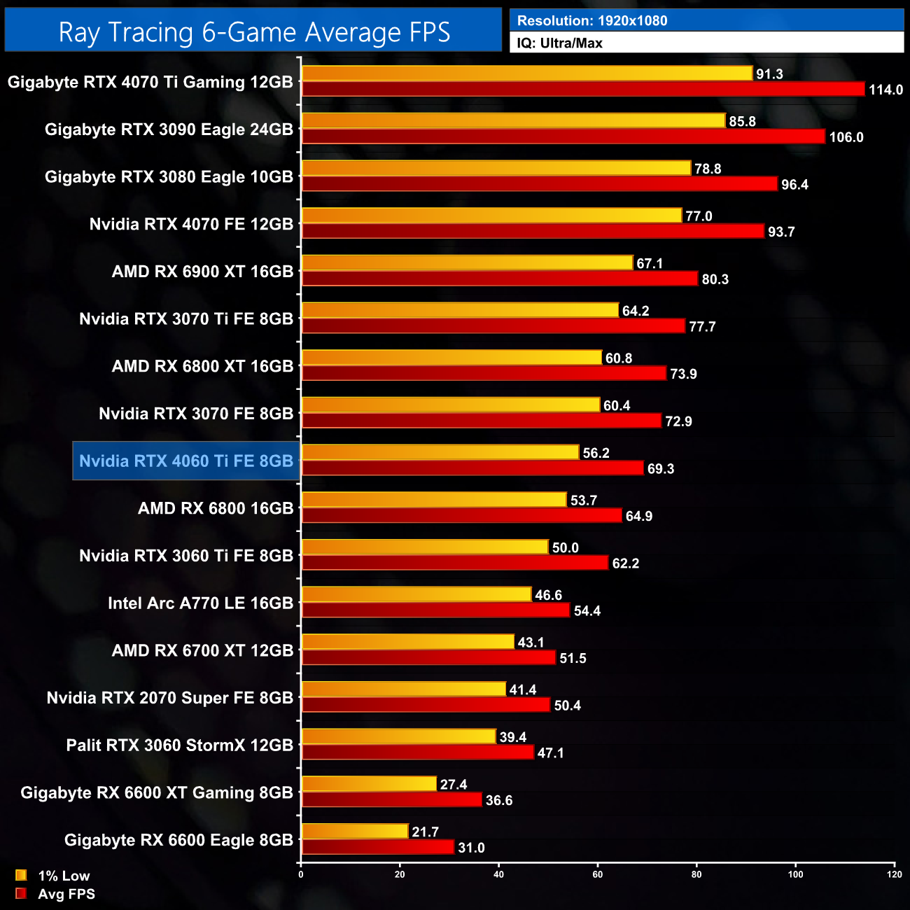 Overall, at 1080p the RTX 4060 Ti delivers 69FPS on average in our ray traced games – nice. That makes it 11% faster than the RTX 3060 Ti, which is exactly the same margin we saw in our rasterised gaming average. Nvidia holds a clear lead over AMD for ray tracing however, with the 4060 Ti 35% faster than the RX 6700 XT, and even a touch ahead of the RX 6800.