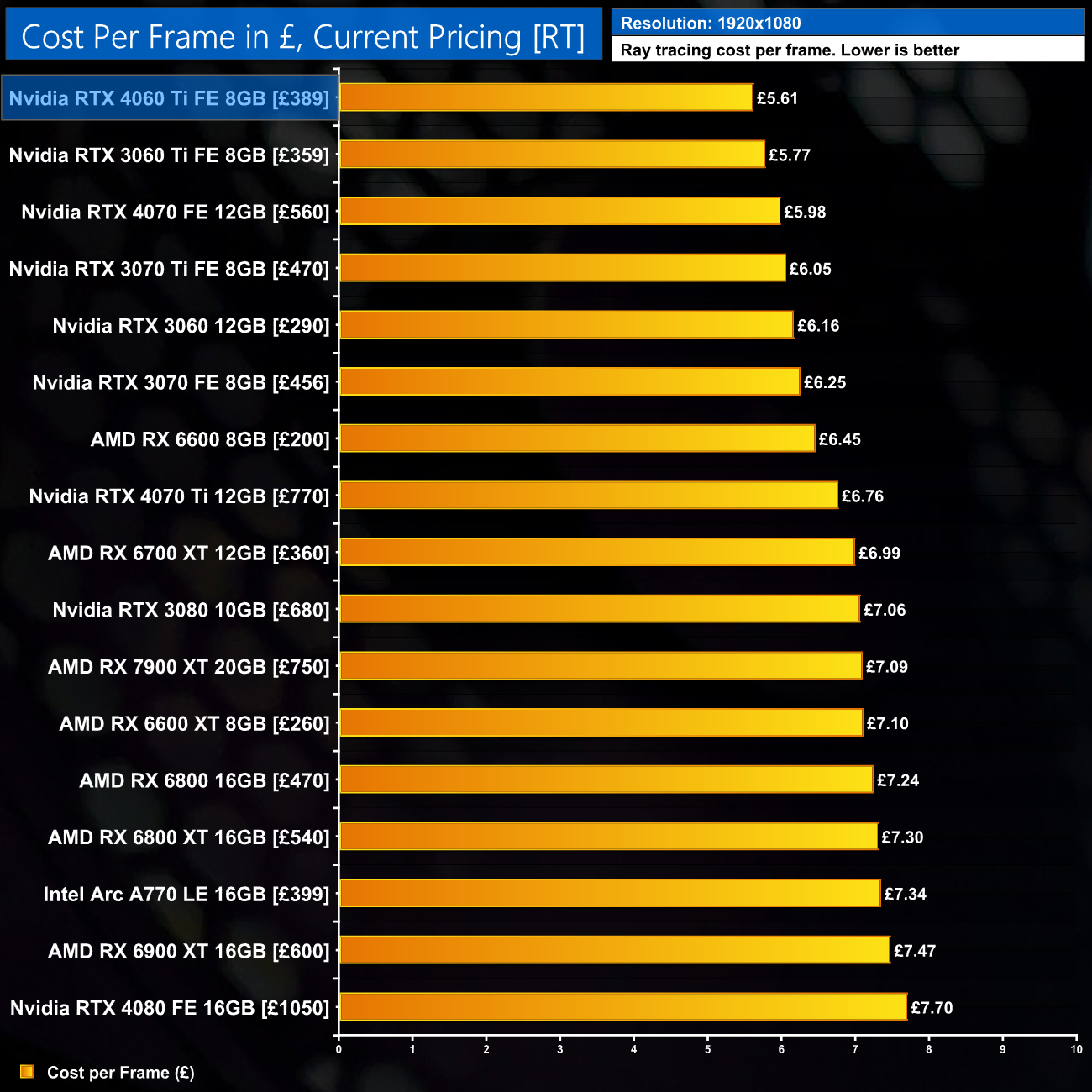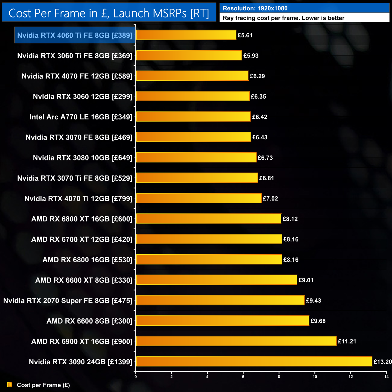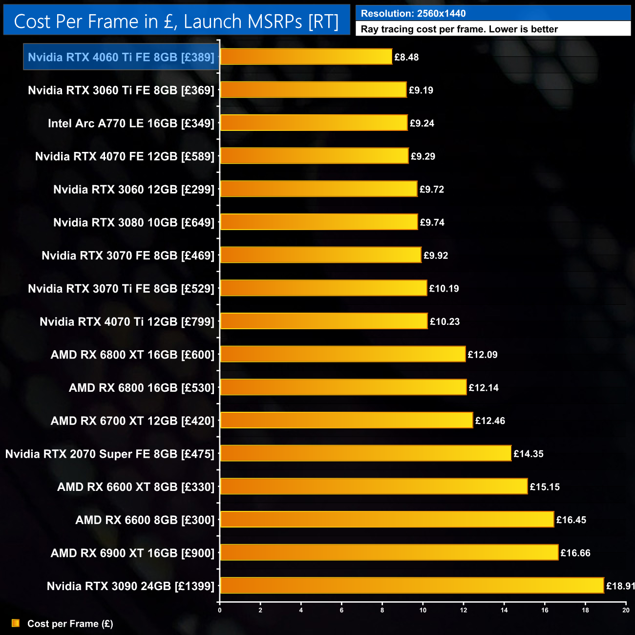 Ray tracing cost per frame, at 1080p, is exactly the same as the cost per frame data showed earlier in this review – the performance margins are identical, resulting in just a 5% improvement in value for 4060 Ti versus its predecessor.