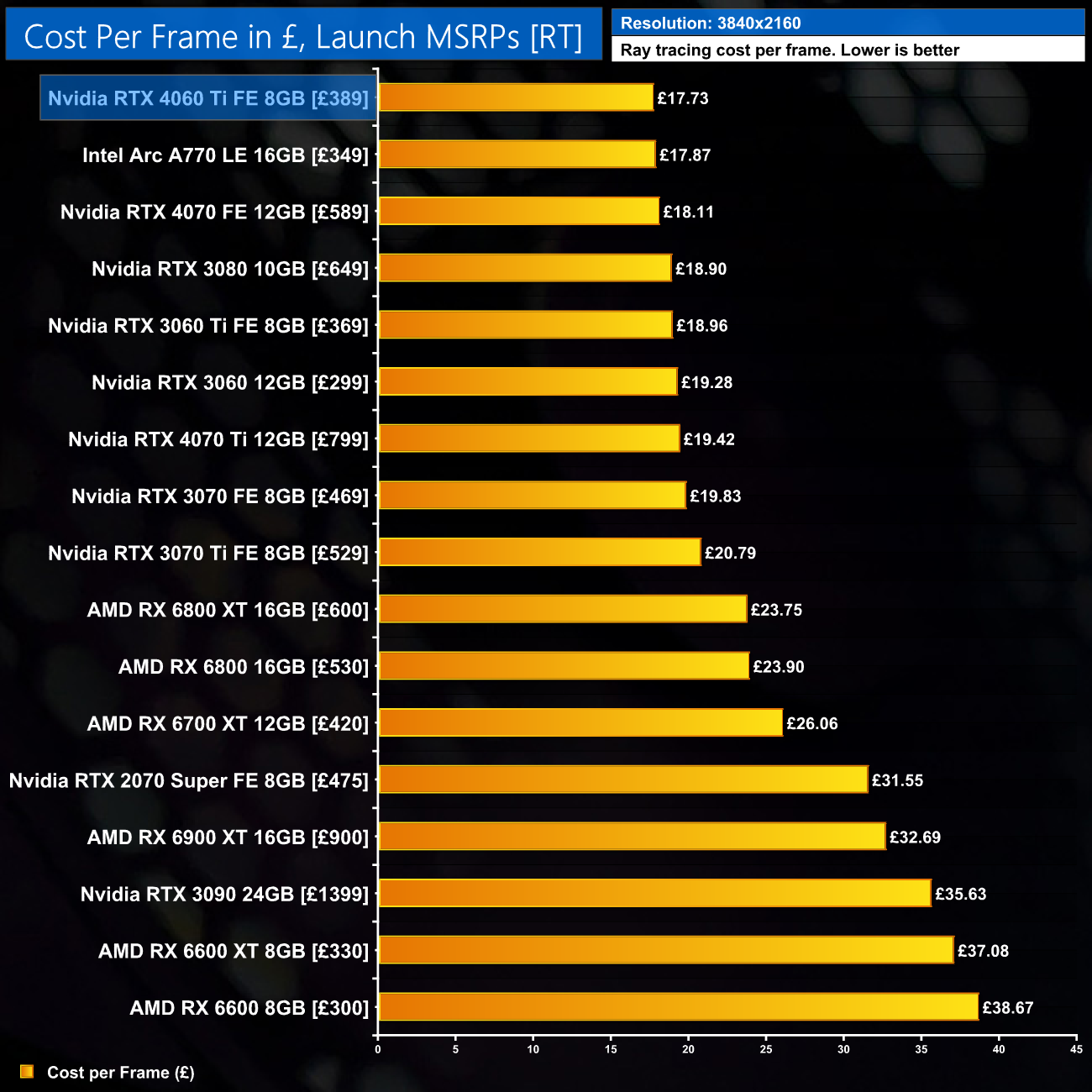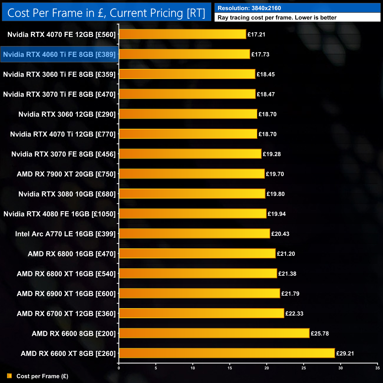 Likewise, for our ray tracing cost per frame based on current retail pricing, the margins are all very similar to what was shown earlier in the review. That means the 4060 Ti is able to sit atop the charts, but only with the slenderest of advantages over previous-gen offerings.