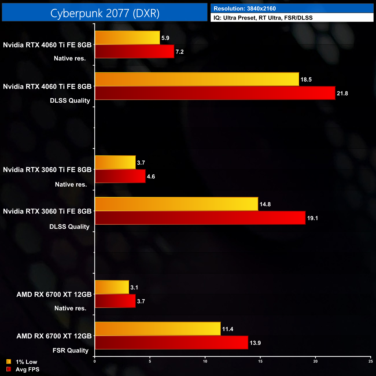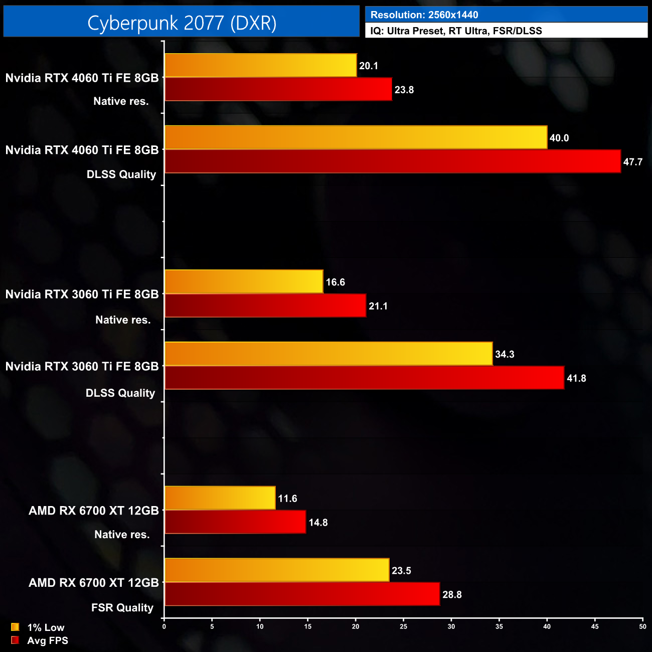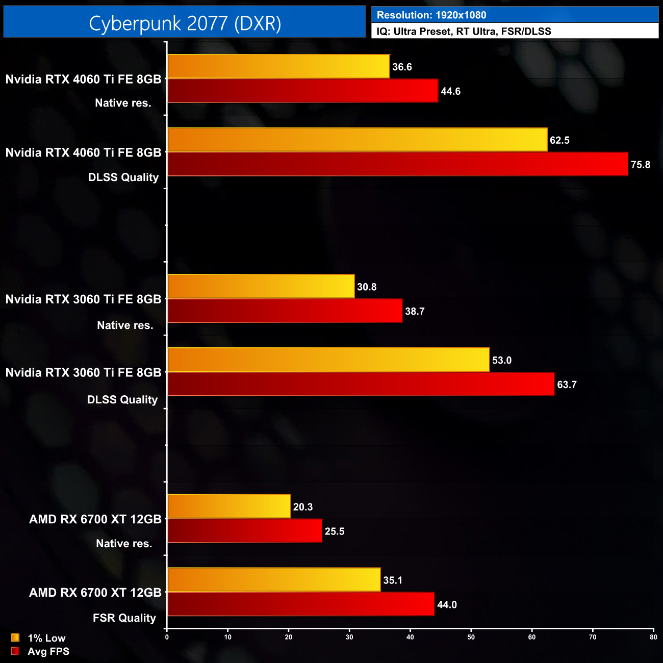 Cyberpunk is a great example of what can be achieved with DLSS 2 Super Resolution. At 1080p, the 4060 Ti gets a 70% boost to its average frame rate, taking it from 45FPS all the way up to 76FPS, while keeping the 1% lows above 60FPS too.