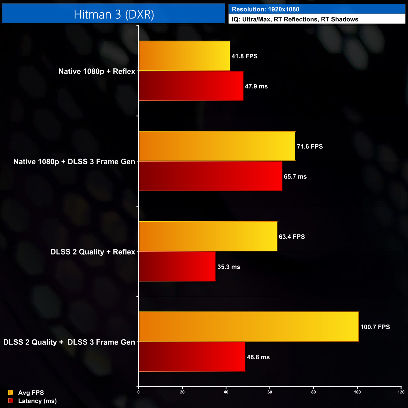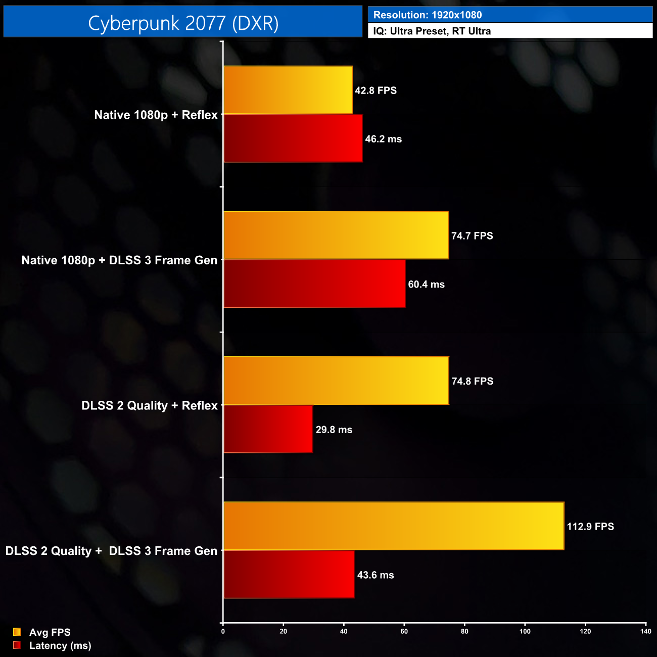 Of course, we also test DLSS 3, enabling Frame Generation on its own, and in conjunction with DLSS 2 Super resolution. Frame Gen on its own offers almost identical frame rates to DLSS 2 Quality, albeit with higher latency. Enabling both together gets us over the 100FPS mark, with latency just a touch lower than native resolution.