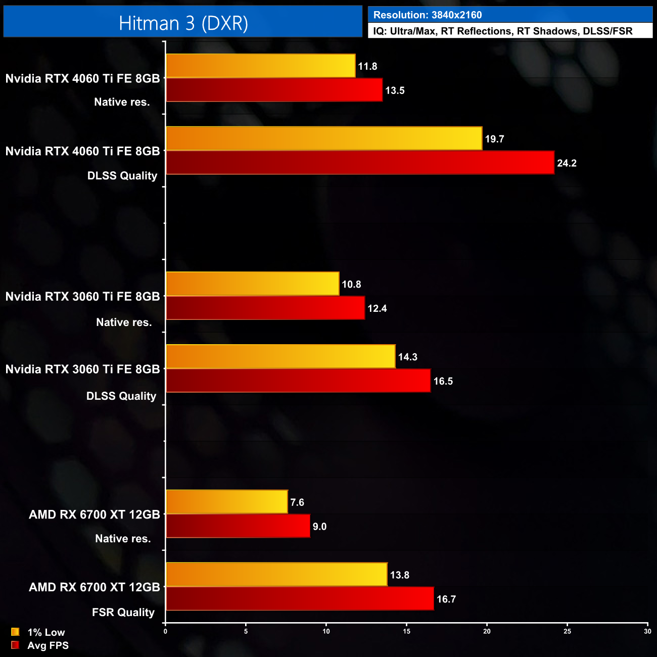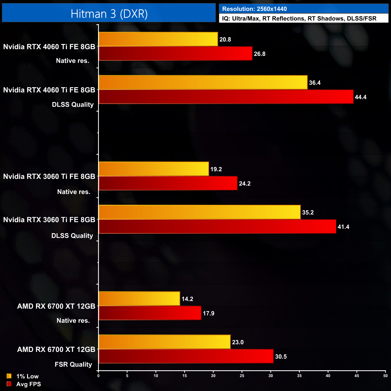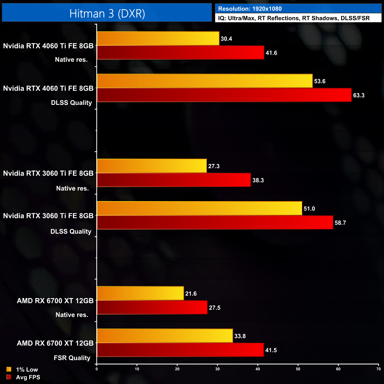 Hitman 3 sees decent gains from DLSS 2 as well. At 1080p the RTX 4060 Ti benefits to the tune of 52%, taking frame rates well over 60FPS – though of course the same can be done for the RTX 3060 Ti, so the actual margin between the two is still minimal.