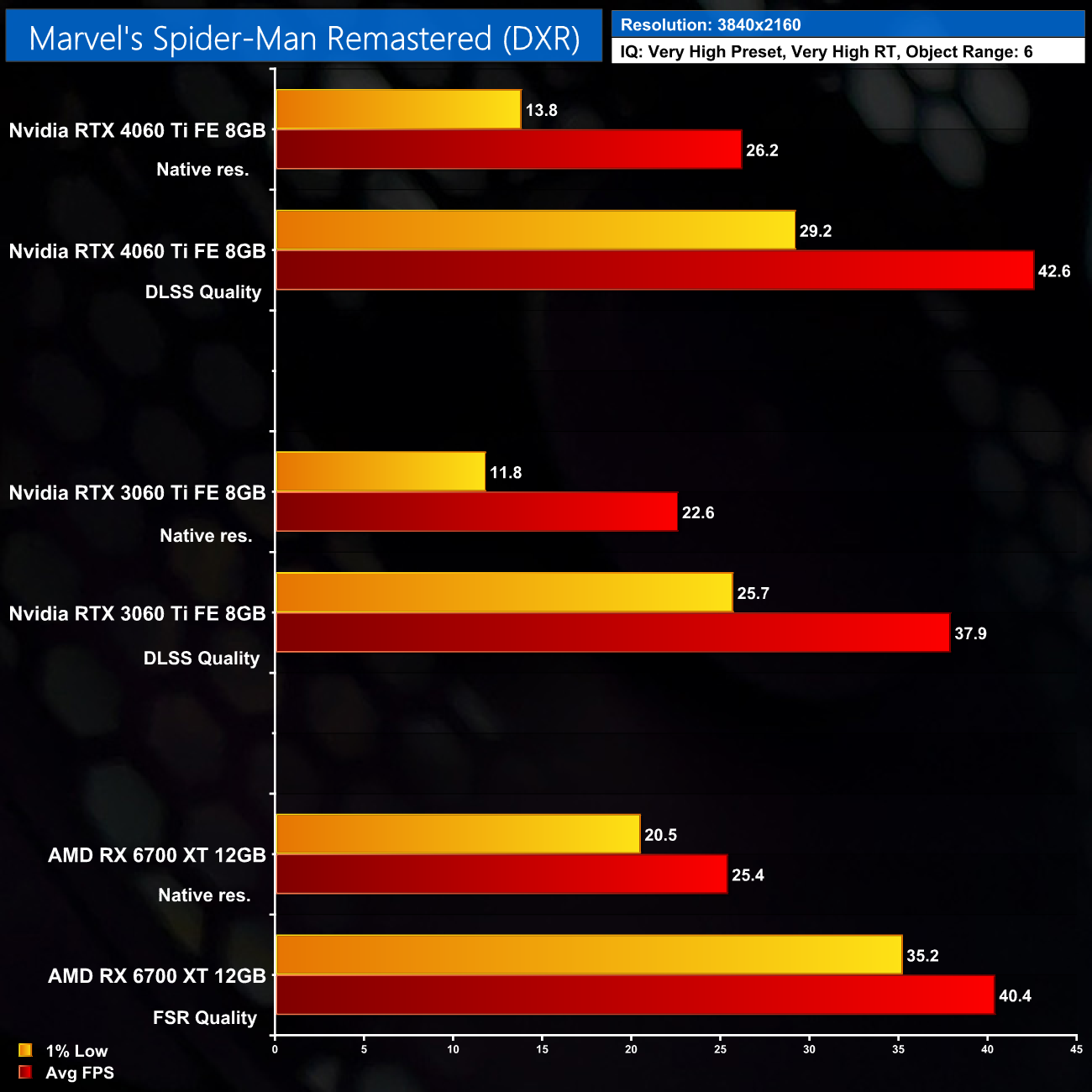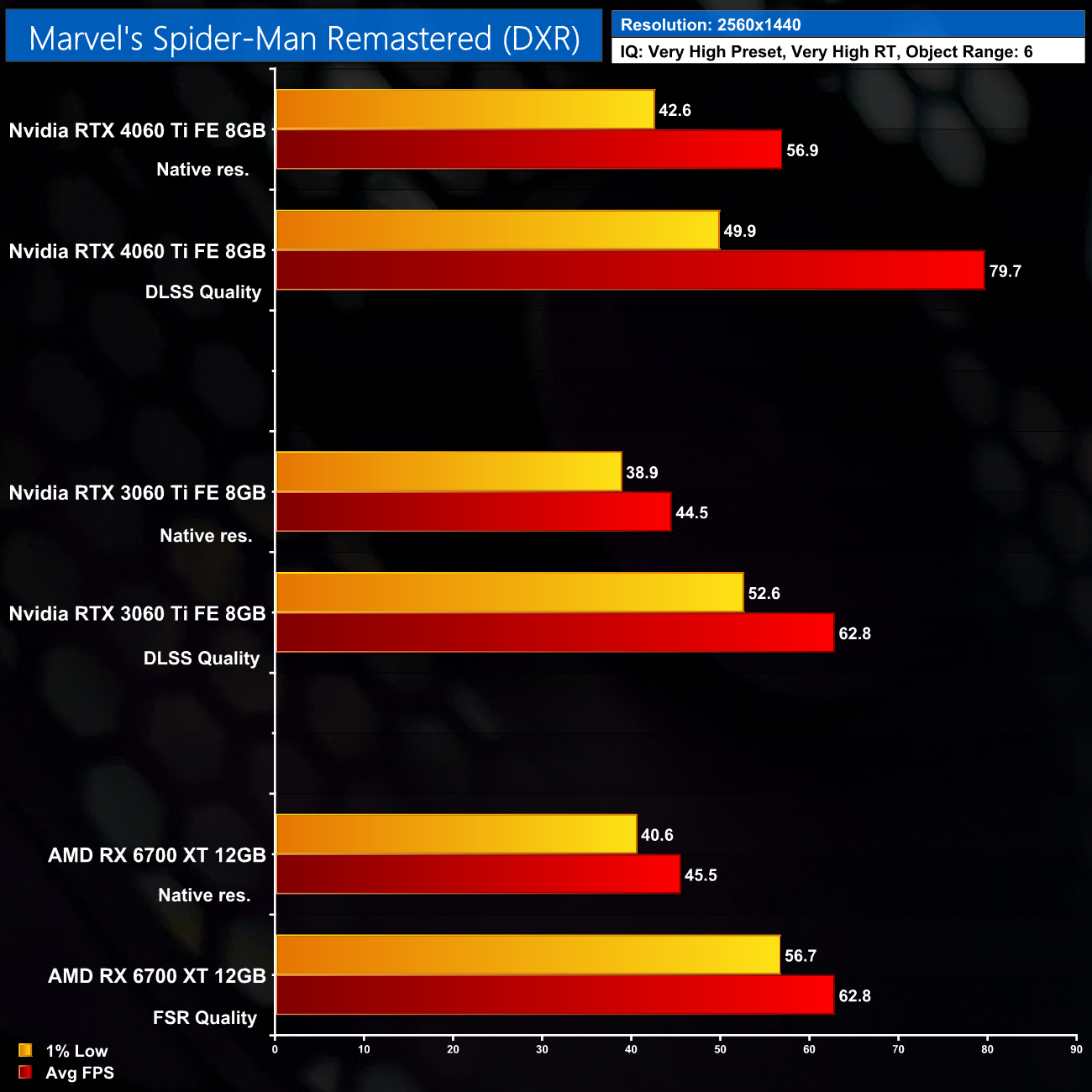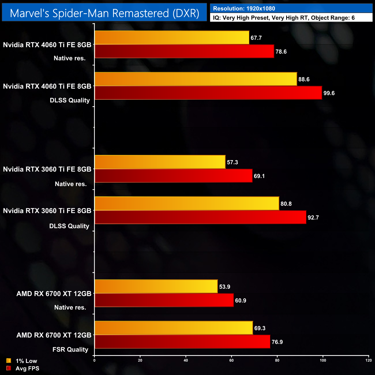 The gains from DLSS 2 are smaller in Spider-Man, possibly due to this game being more CPU heavy – we're only looking at a 27% uplift at 1080p for the 4060 Ti.