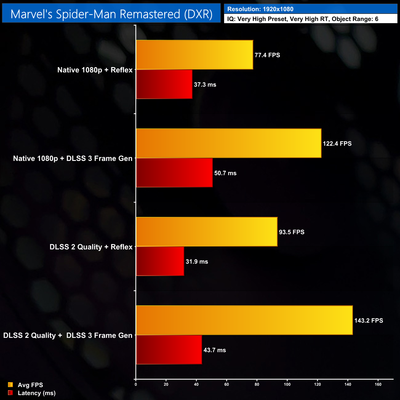 This time around, DLSS 3 Frame Generation is able to offer a higher frame rate than simply using DLSS 2 Quality, though the latency is almost double. The ideal situation would be using DLSS Super Resolution alongside Frame Generation, delivering 100FPS exactly, with latency almost identical to what we see at native resolution.