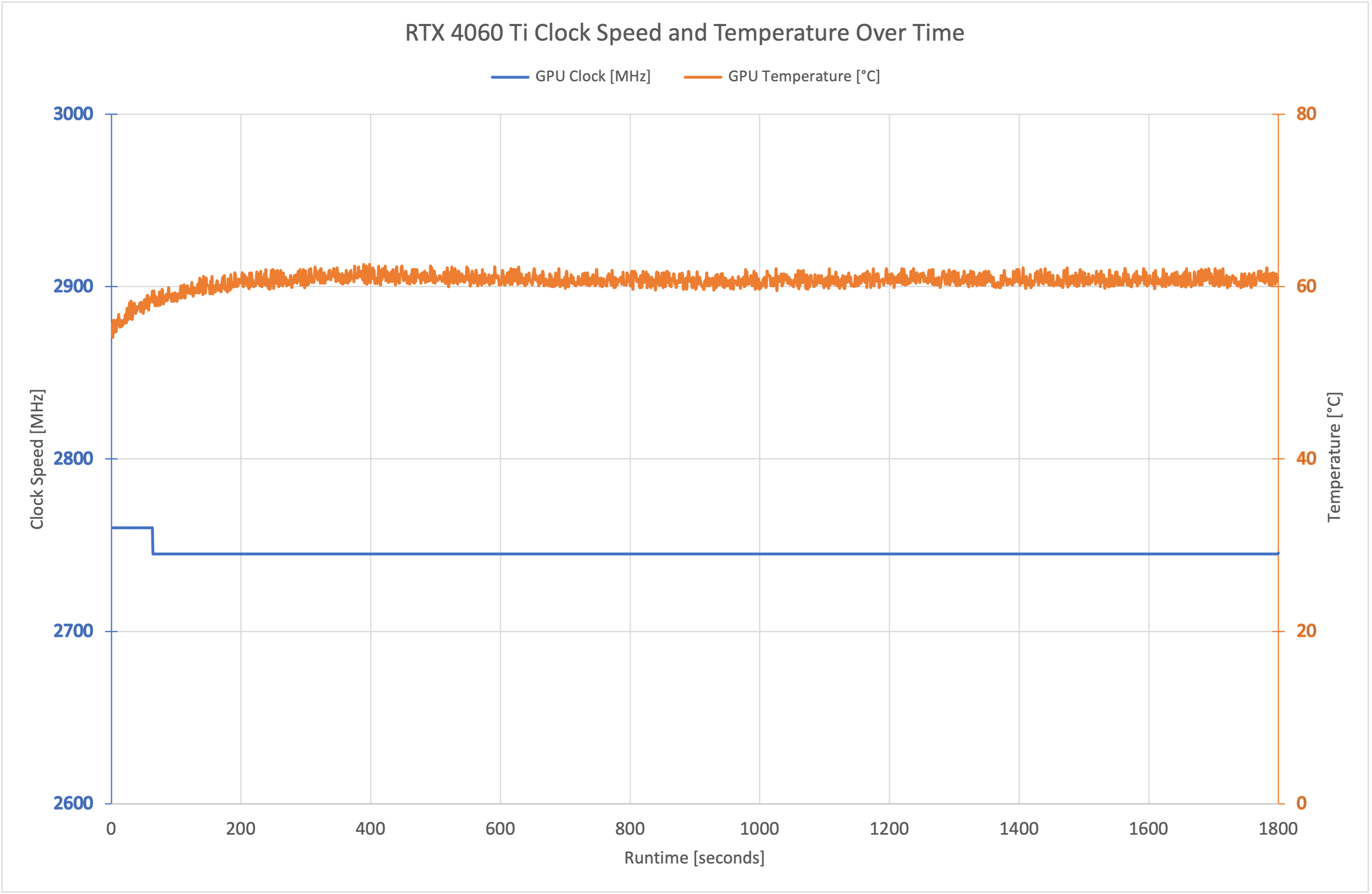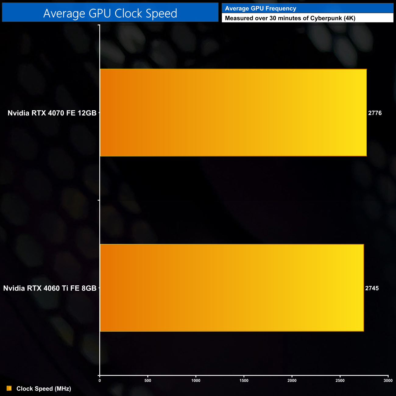 Overall clockspeed behaviour is similar however, the 4060 Ti is more voltage limited than power limited, so apart from the first minute of our stress test where it operated at 2760MHz, it held completely locked at 2745MHz for the rest of the 30-minute benchmark.