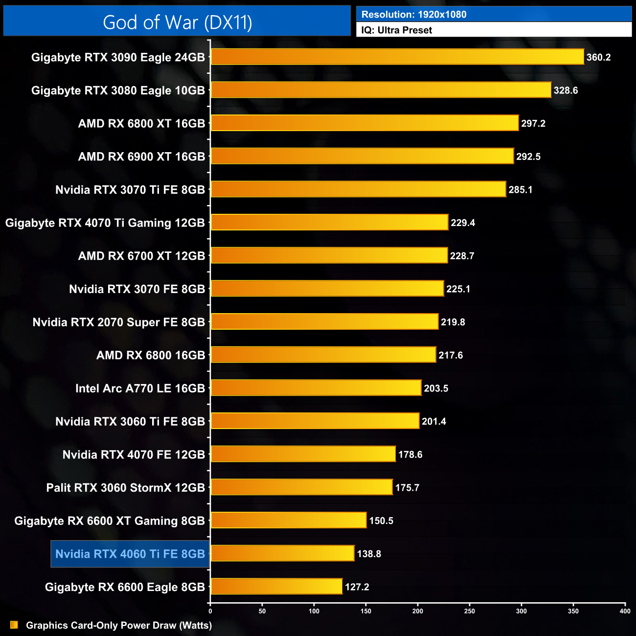 In terms of power draw, Nvidia rates the RTX 4060 Ti for a 160W TGP, but also claimed just a 140W average gaming power draw. Over the 12 games we tested at 1080p, that's pretty accurate, with our results showing an average of 142.8W. Some games do hit the 160W figure – including Days Gone and A Plague Tale: Requiem – but most are well below that.