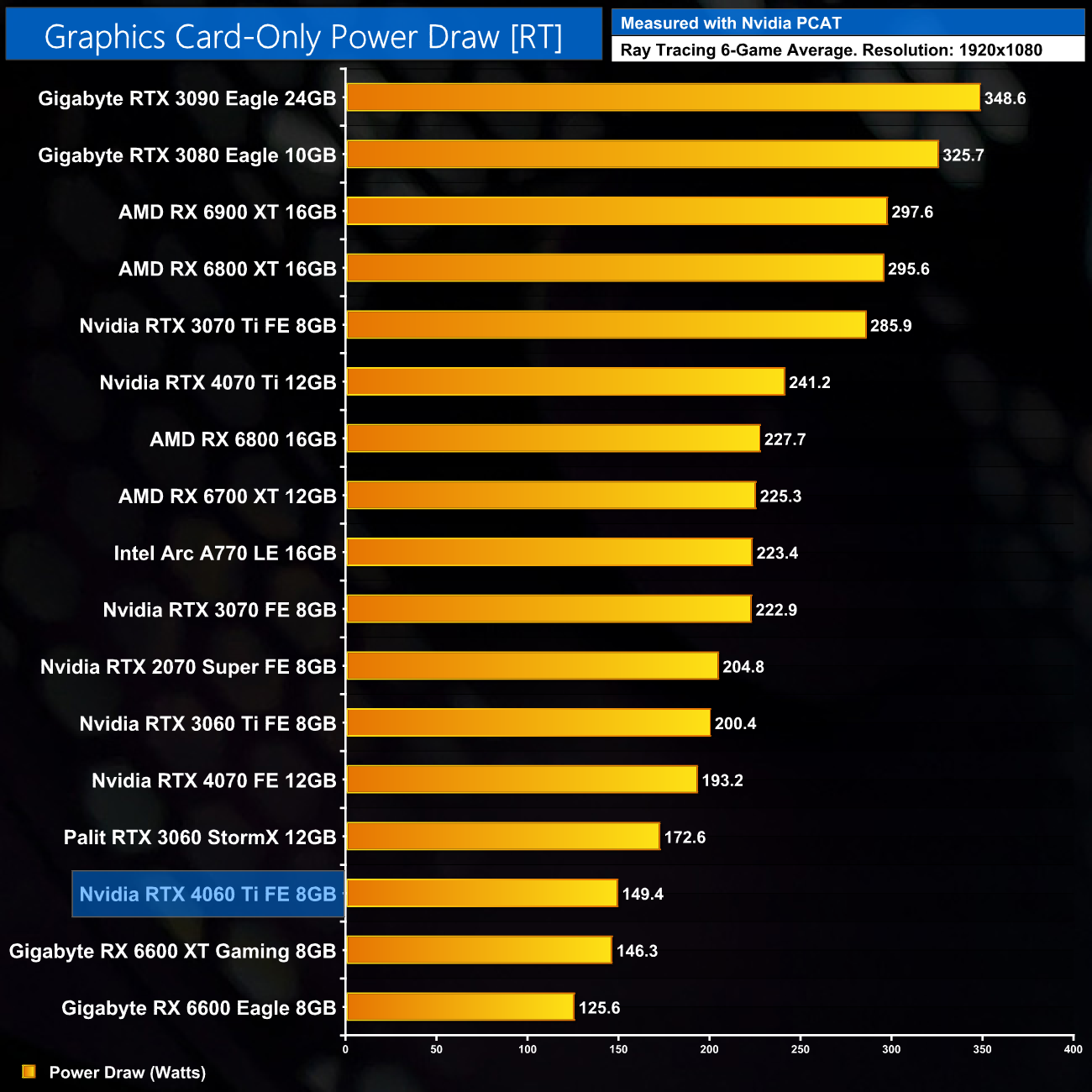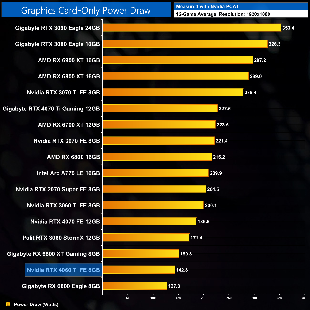 Here we present power draw figures for the graphics card-only, on a per-game basis for all twelve games we tested at 1080p. This is measured using Nvidia's Power Capture Analysis Tool, also known as PCAT. You can read more about our updated power draw testing methodology HERE.