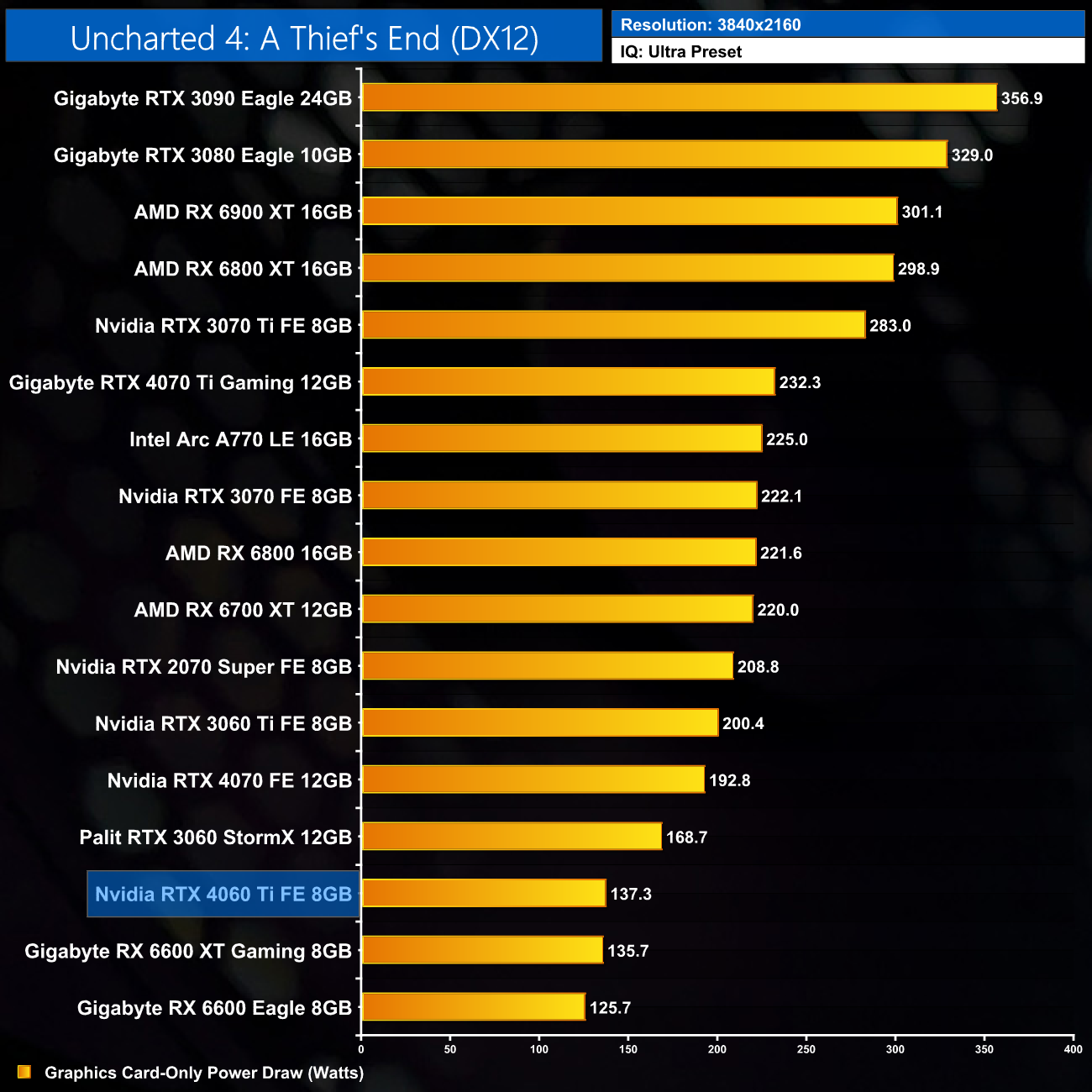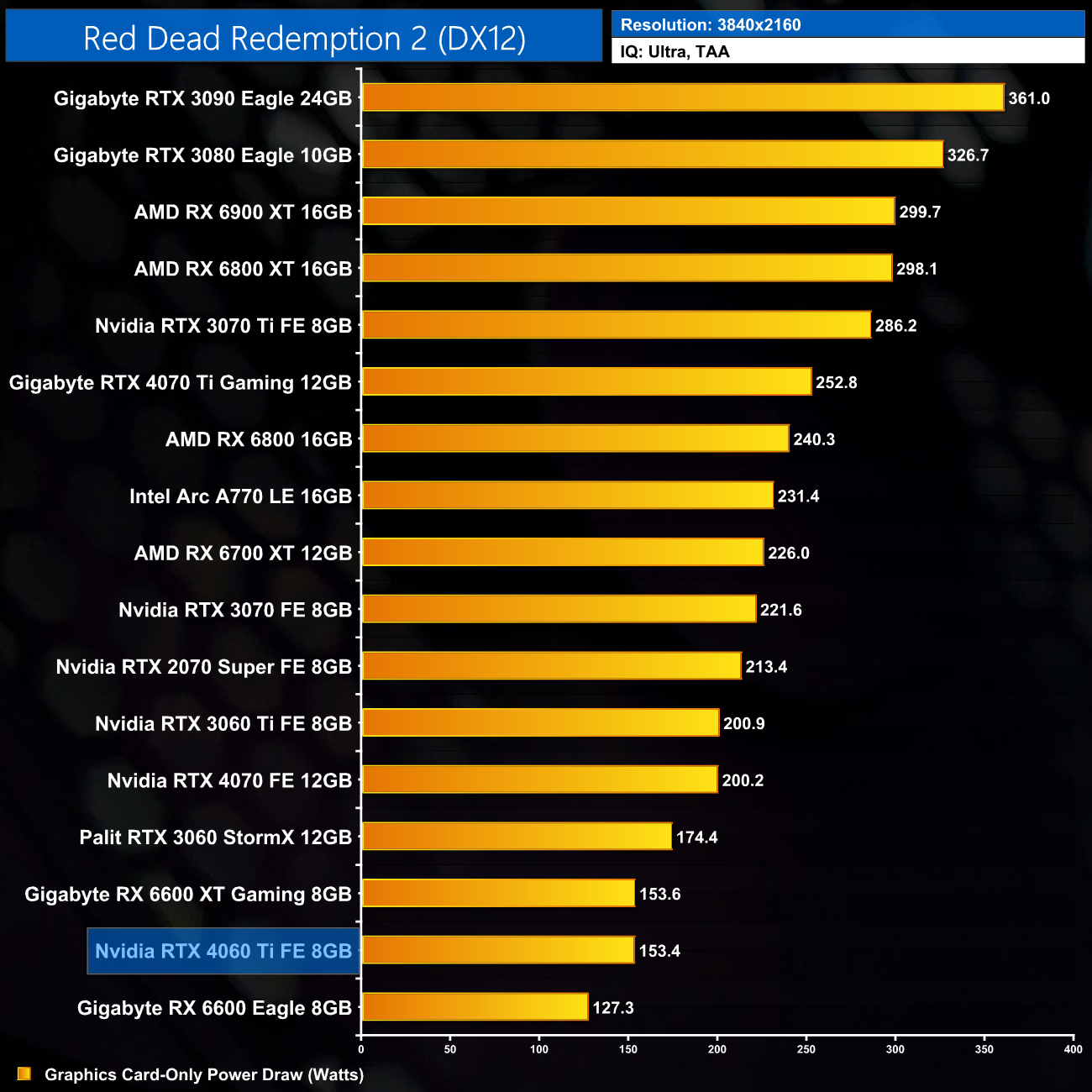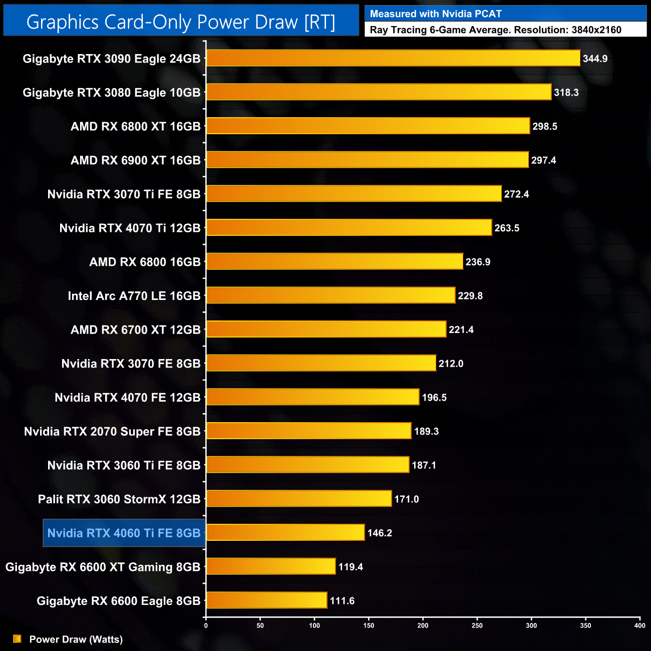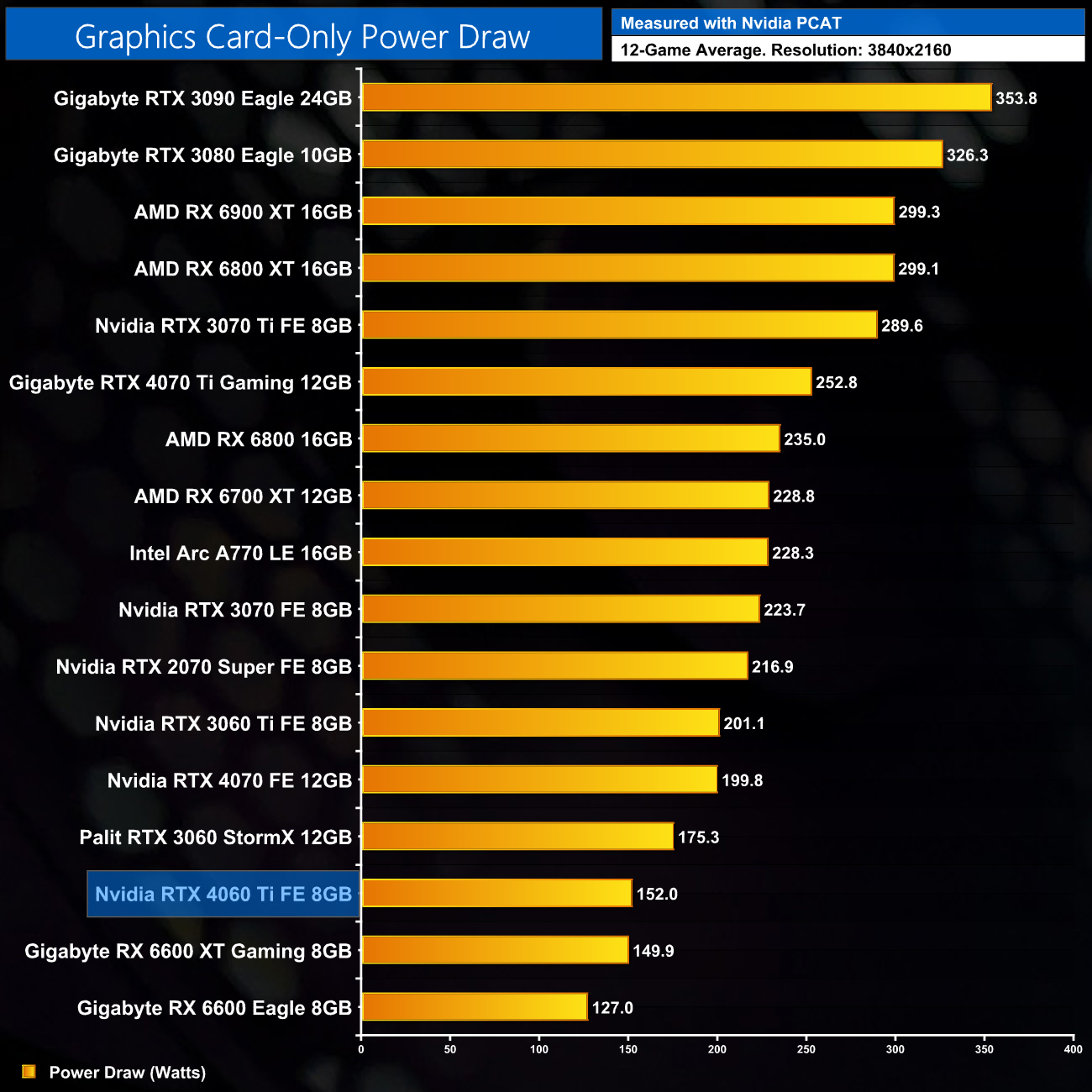 Finally, up at 4K, we see a new average of 152W power draw for the RTX 4060 Ti – even at UHD, it's not reaching the 160W TGP.