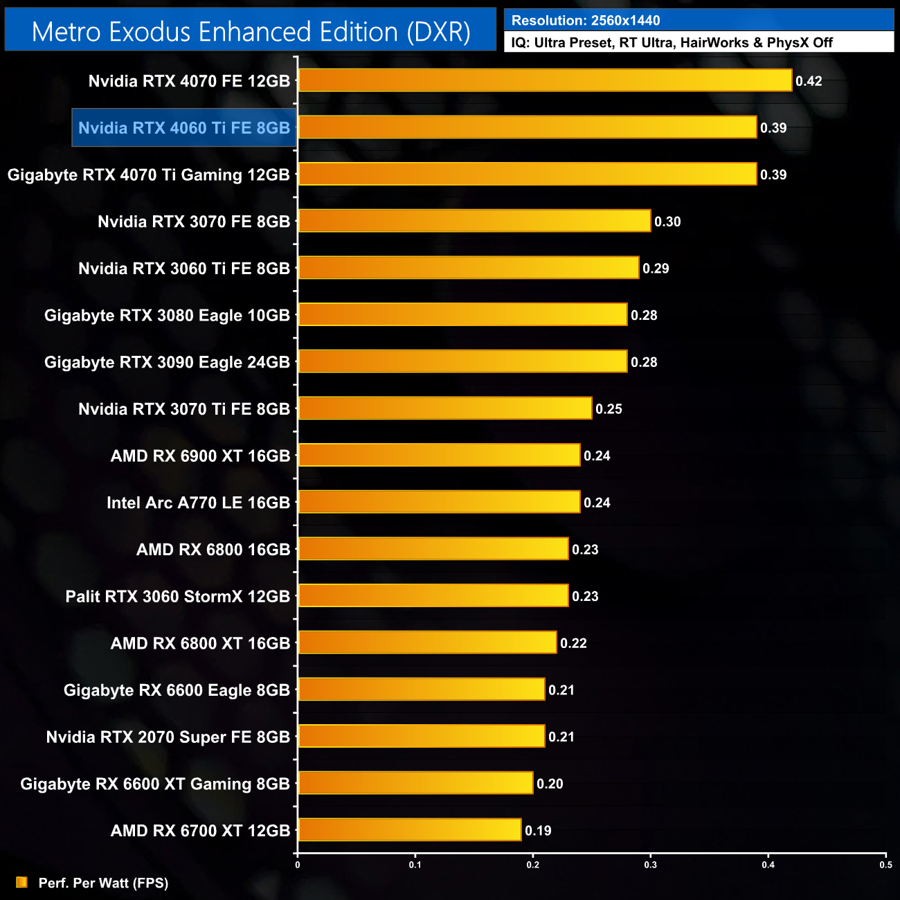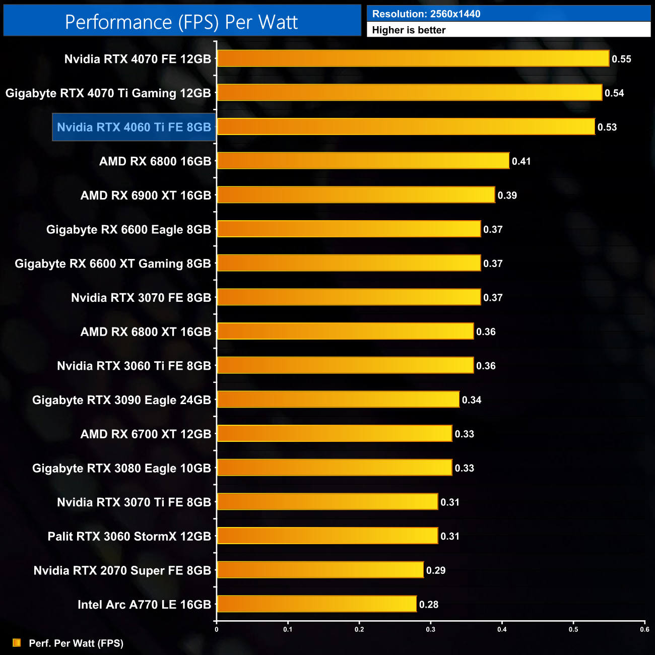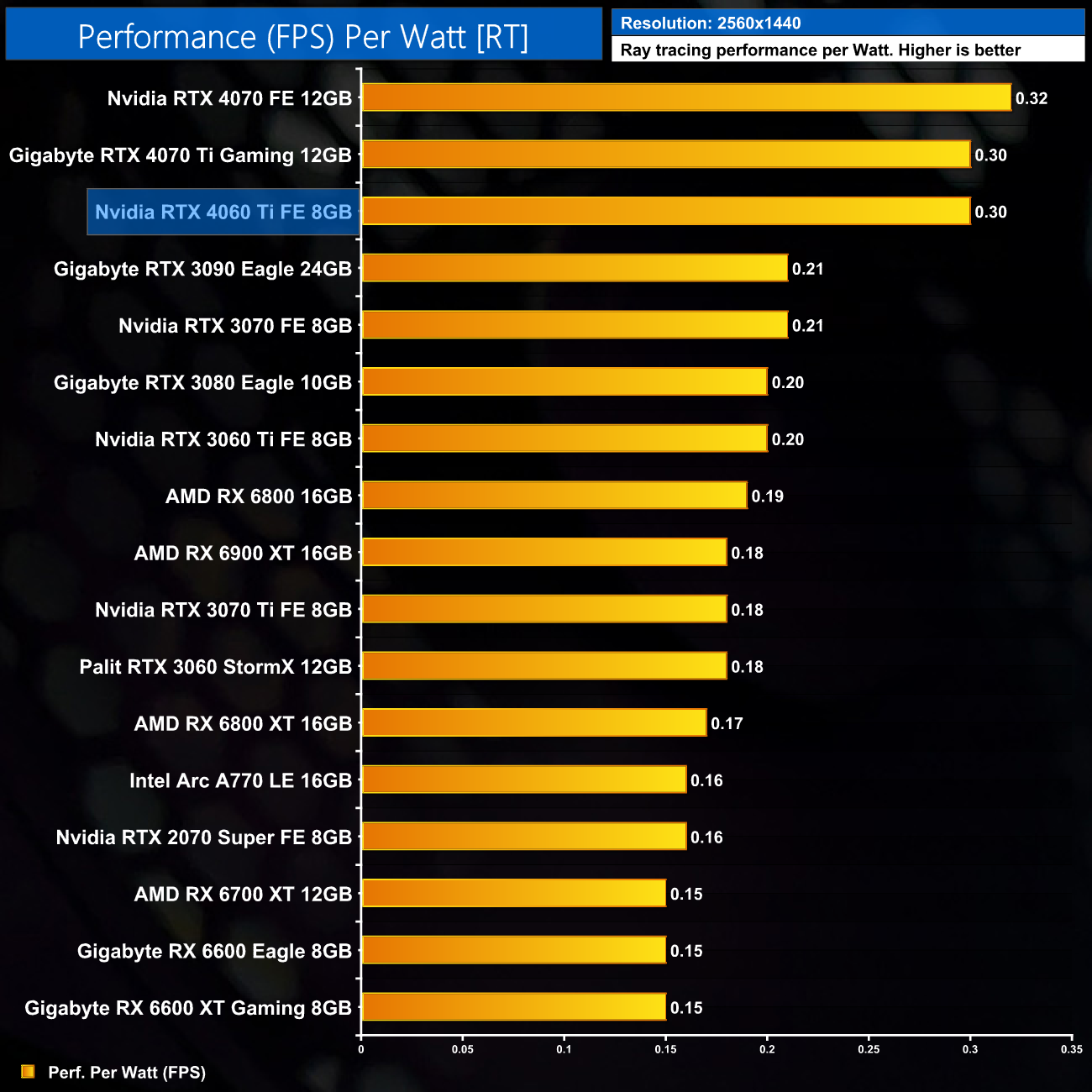 For ray tracing efficiency at 1440p, the 4060 Ti continues to offer big gains over the previous generation, this time with a 50% uplift versus the 3060 Ti.