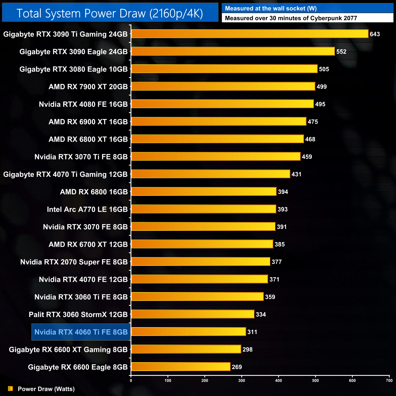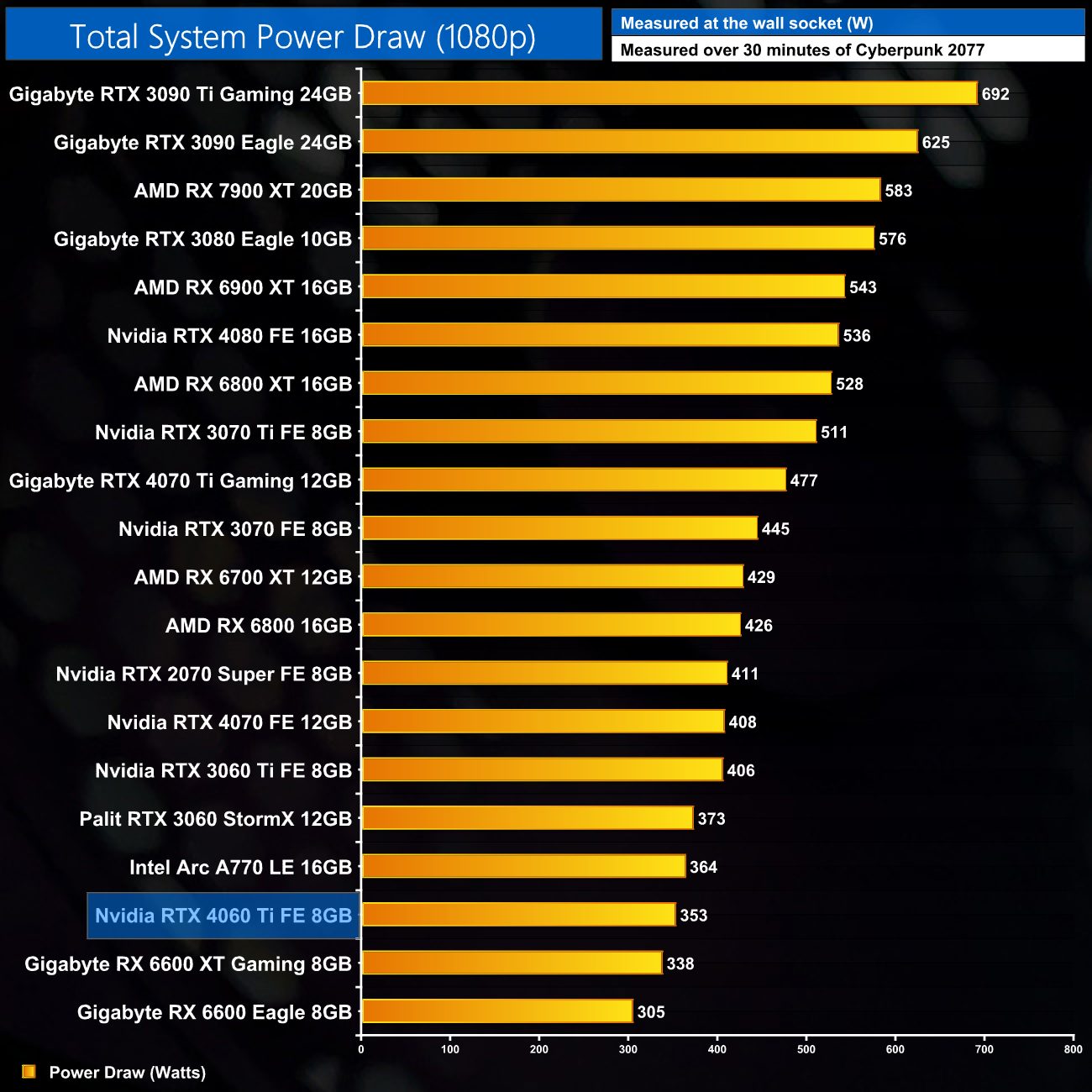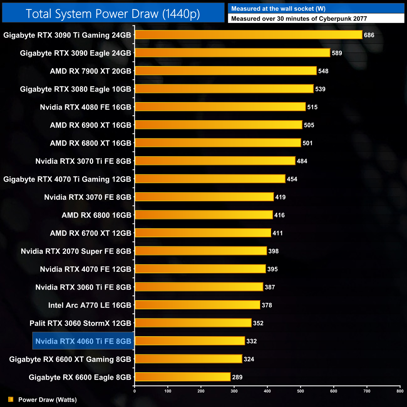 Total system power draw is very low, even with an i9-13900KS – we're talking in the region of 350W at 1080p, and slightly lower at the higher resolutions as the CPU load decreases. Nvidia officially recommends a 550W power supply.