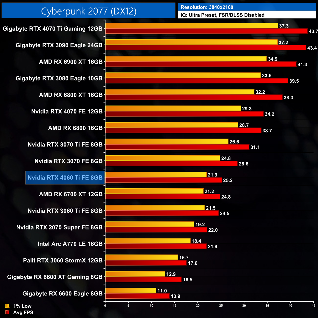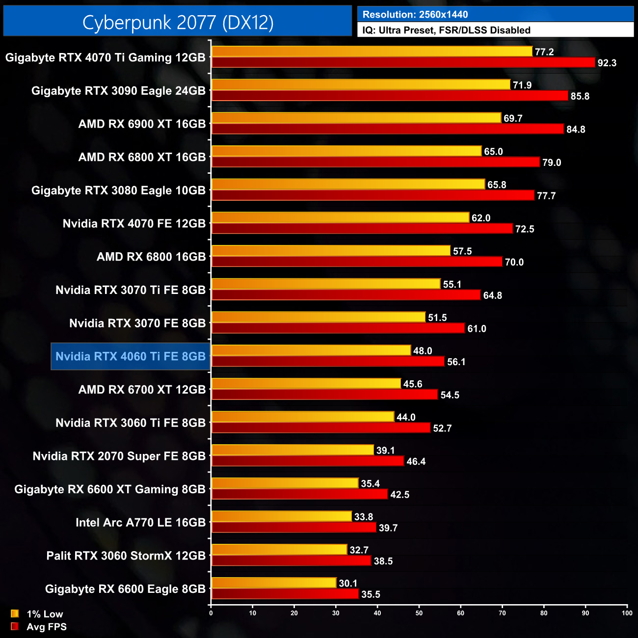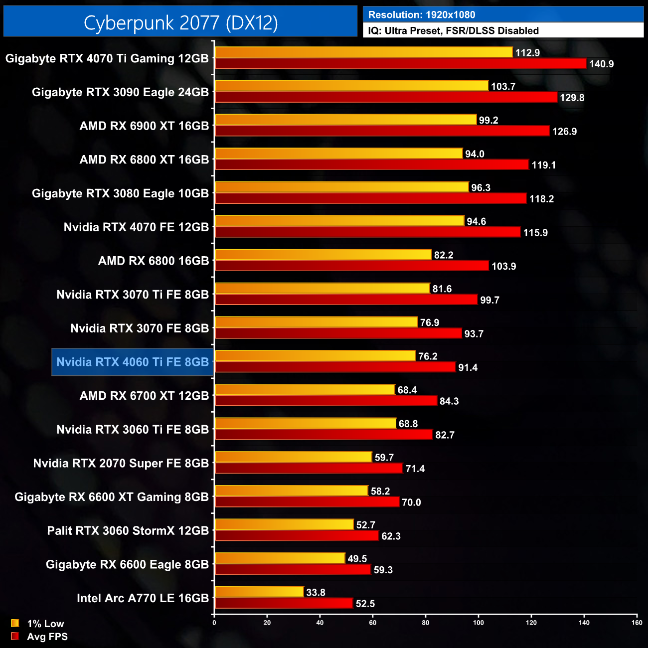 With an average of 91FPS in Cyberpunk 2077, the RTX 4060 Ti is once again very closely matched against the RTX 3070, being just 3% slower. That means it's 11% faster than the RTX 3060 Ti, and 8% ahead of the 6700 XT.